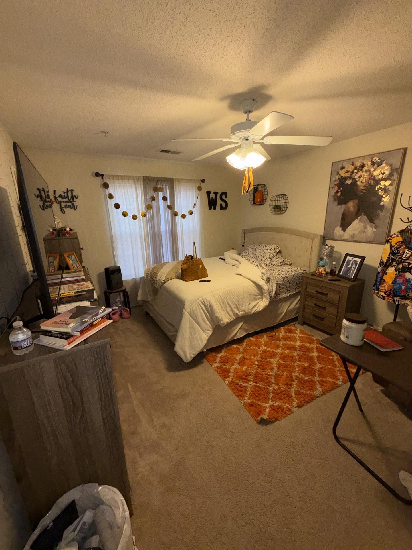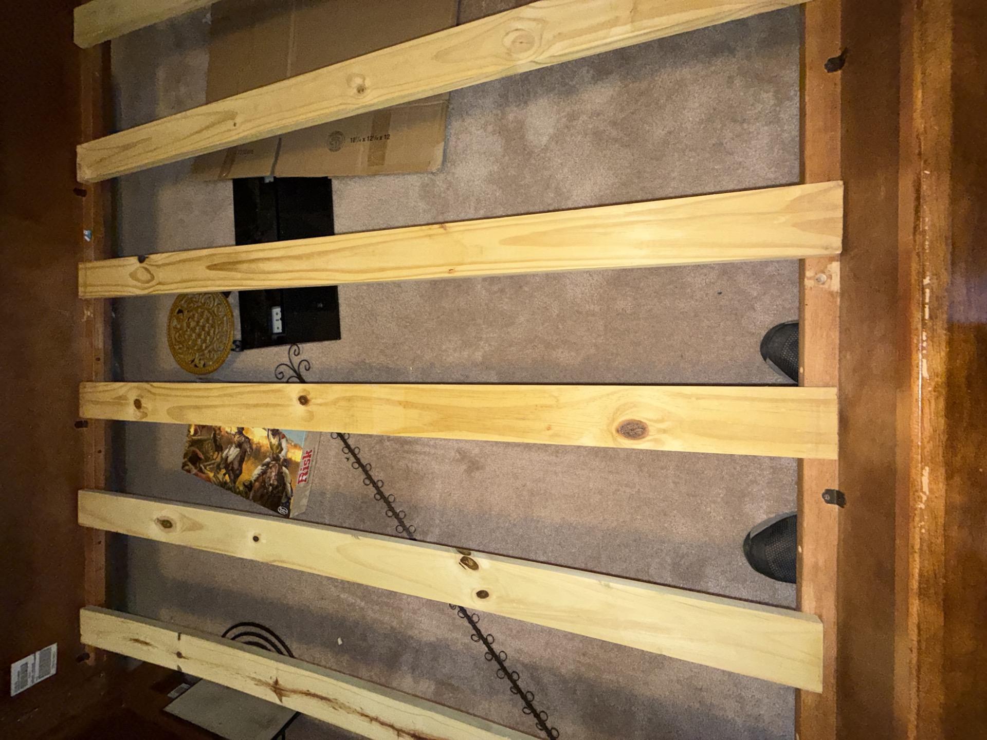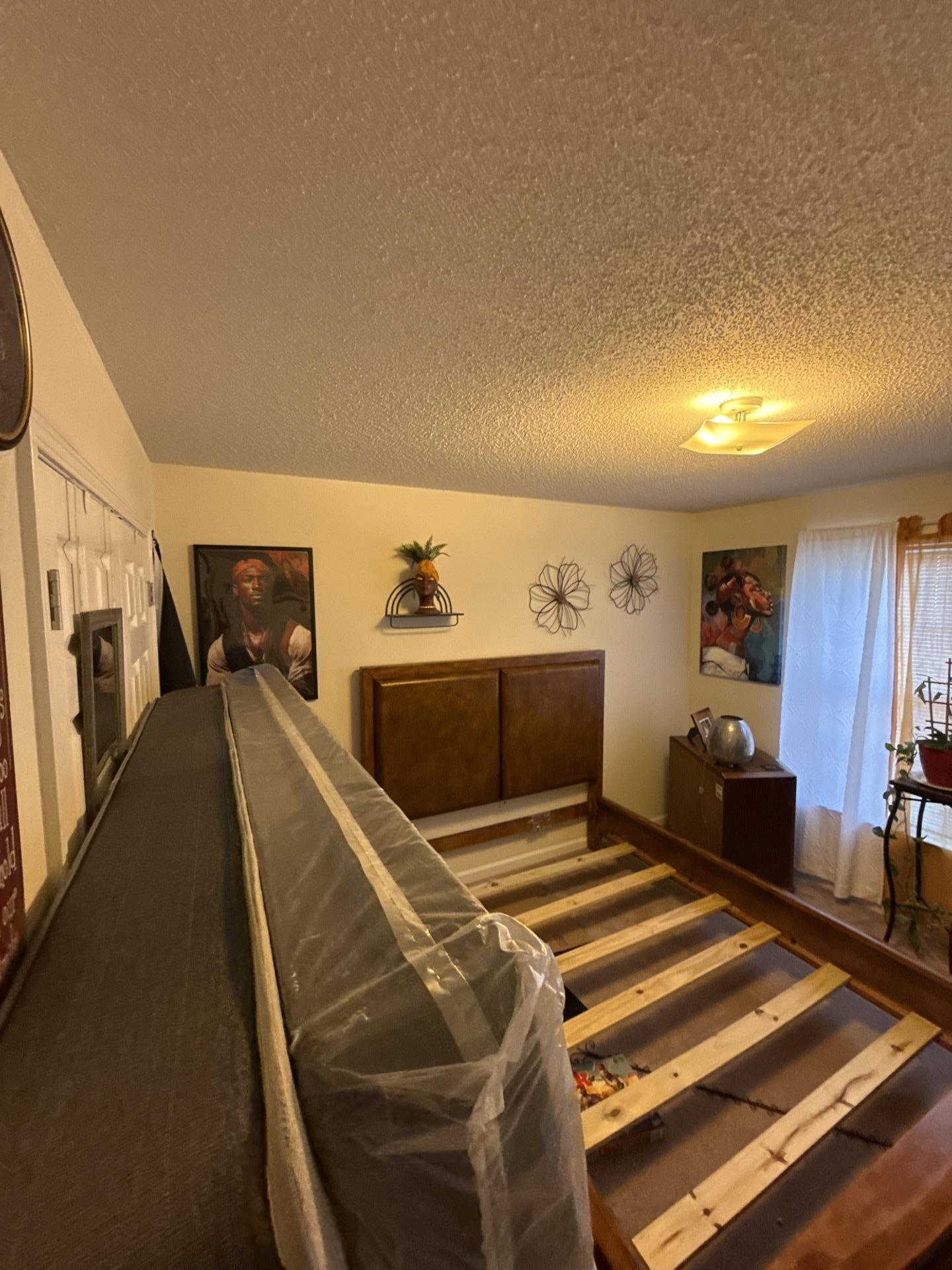 Interior of a bedroom during a comprehensive evaluation, with the mattress moved to facilitate professional moisture removal and ensure proper airflow.