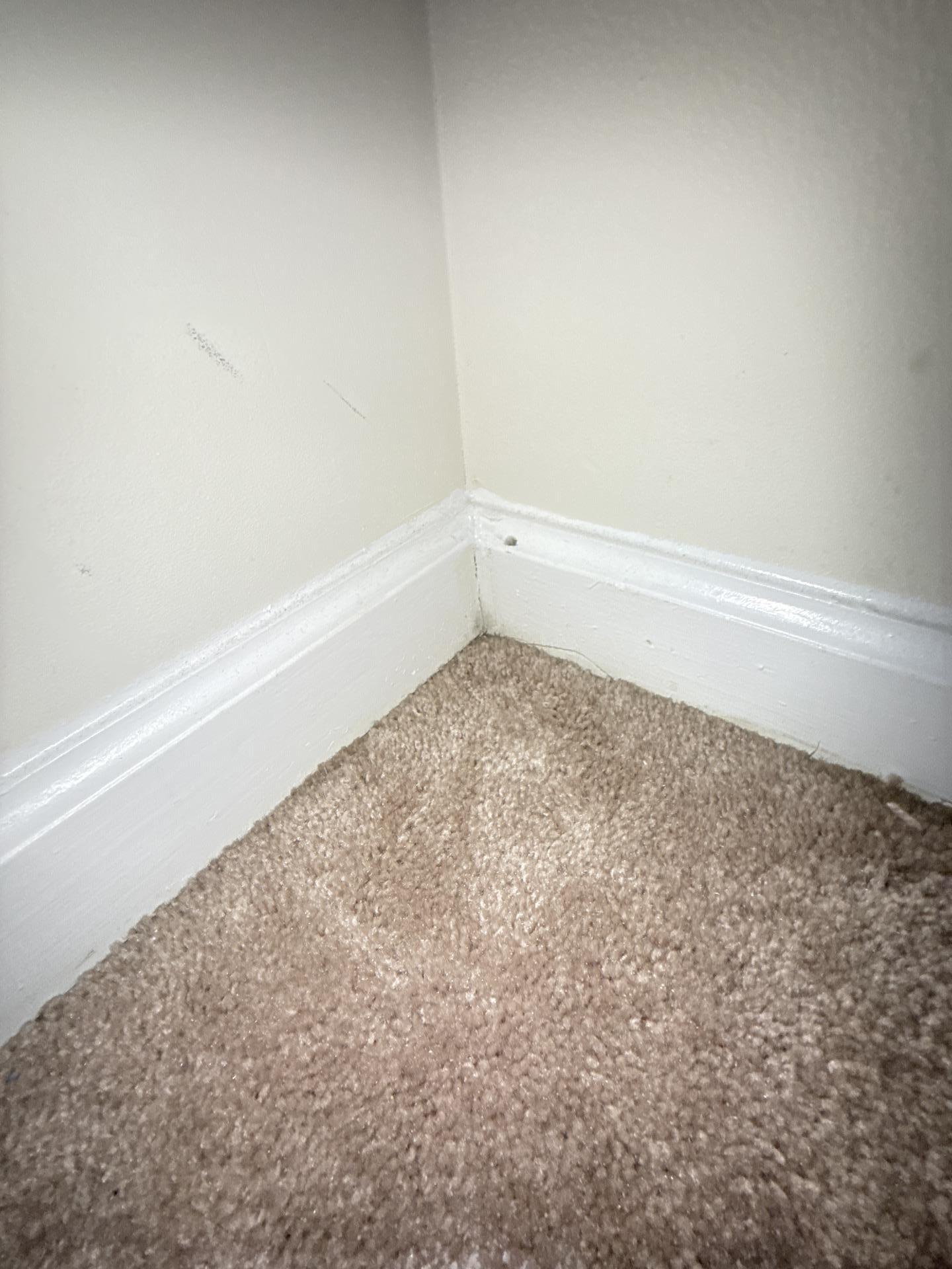 A clean and secure corner of a room featuring restored carpet and baseboards following the completion of moisture mitigation.