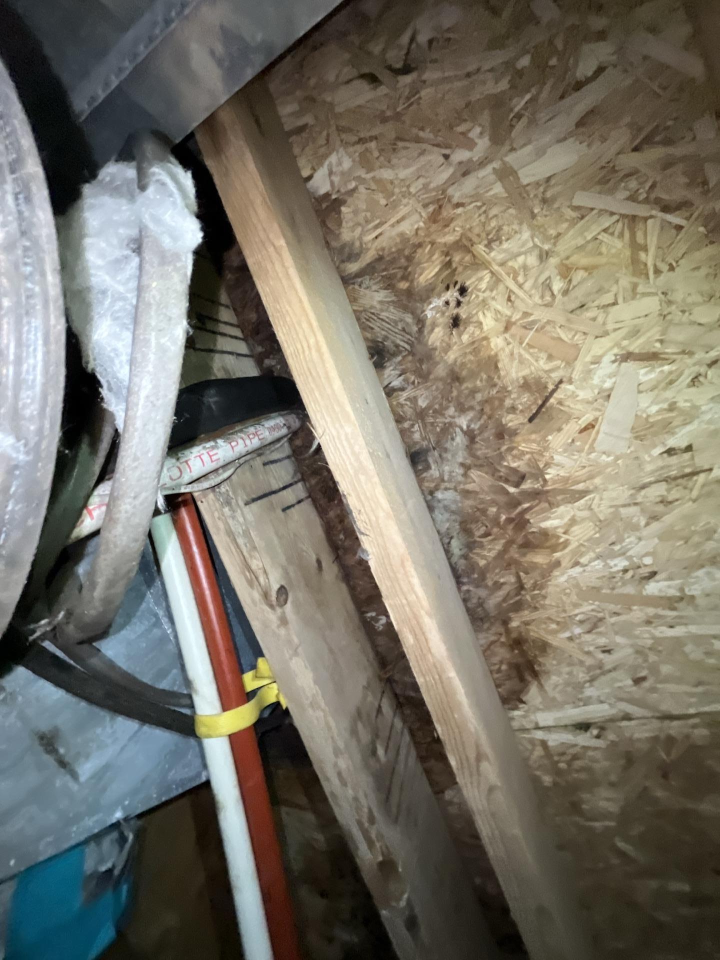 Close-up documentation of an exposed subfloor and joists during a customized drying plan to treat impacted materials and remove trapped moisture.