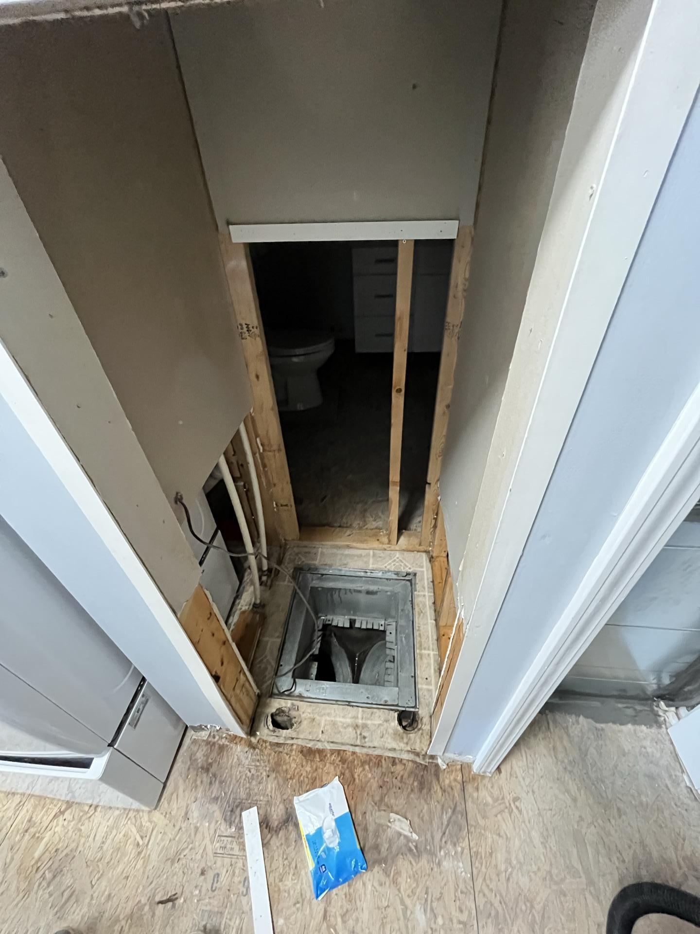 Detailed site review of mechanical venting and surrounding subfloor after drywall removal to ensure no hidden moisture remains in the wall cavity.
