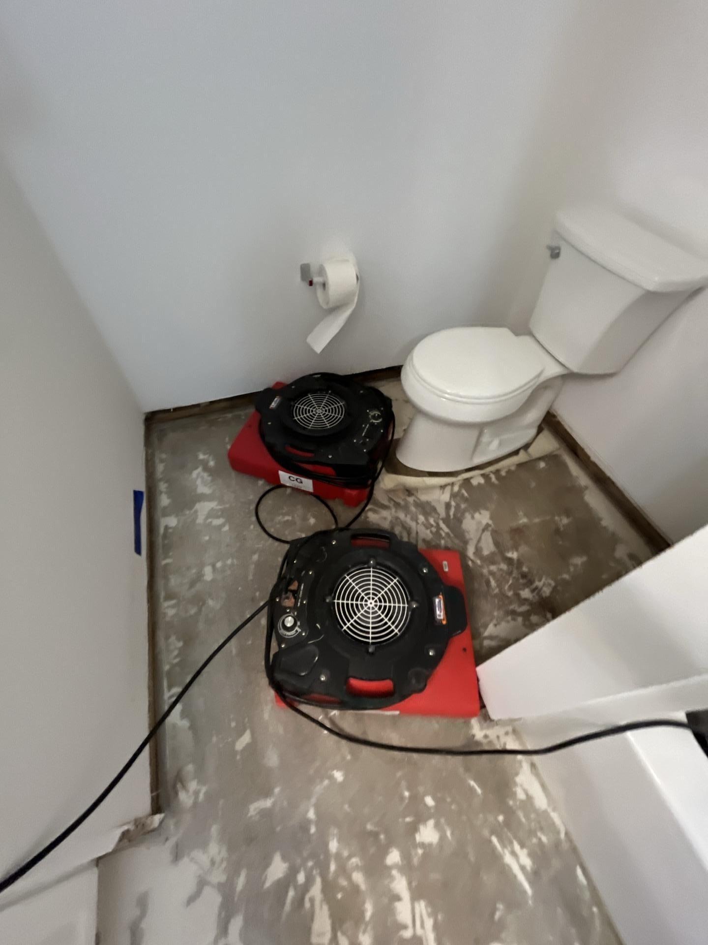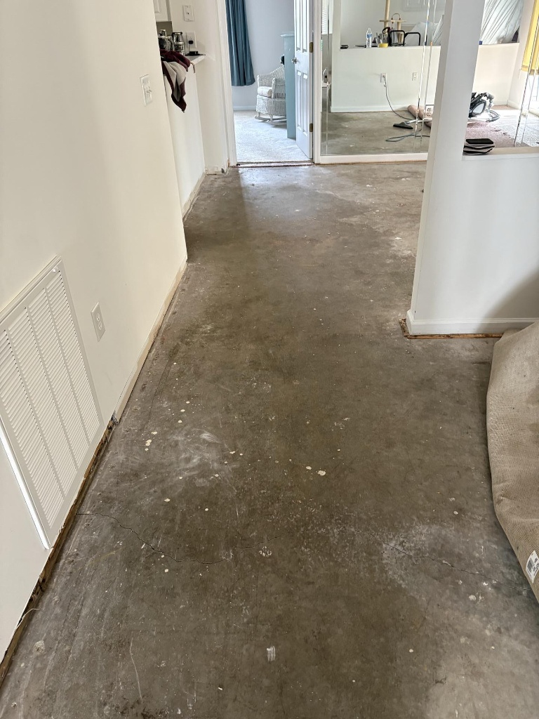 A concrete subfloor cleared and prepared for drying during a property restoration project. By stripping damaged materials, our water damage restoration team ensures that the foundation of the home is completely dry and free of contaminants before repairs begin.