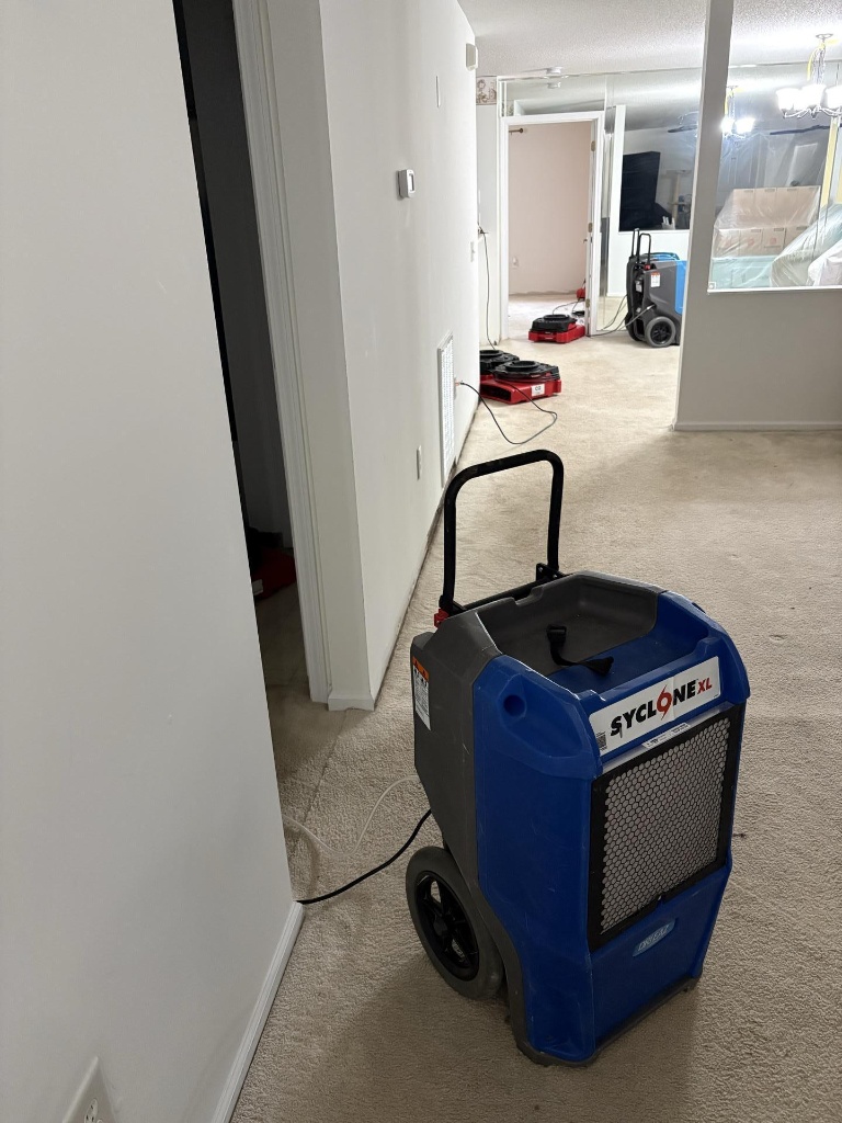 Utilizing a high-capacity Syclone XL dehumidifier and air movers to manage moisture levels across a large living area. This comprehensive water damage restoration setup ensures efficient drying of carpets and walls, providing a complete solution for major property restoration projects