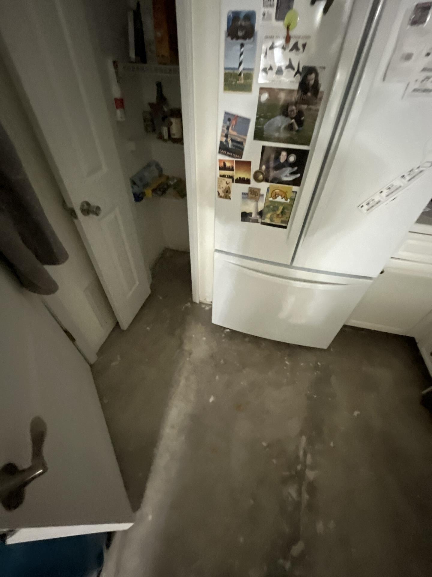 Following water extraction, our team prepared this kitchen and pantry area for deep cleaning and dehumidification. This property restoration service involved removing affected flooring to expose the concrete slab, ensuring a complete and professional water damage restoration