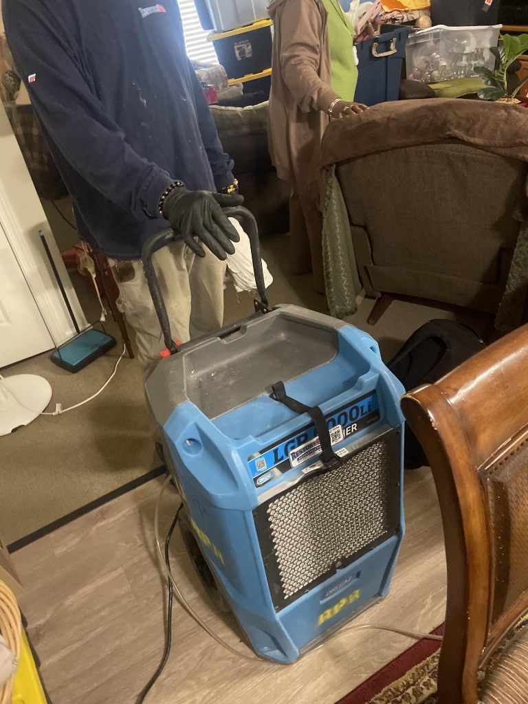 Our property restoration team setting up a professional LGR dehumidifier for efficient drying and dehumidification. This essential step in the water damage restoration process ensures all moisture is extracted to prevent mold growth and further property damage