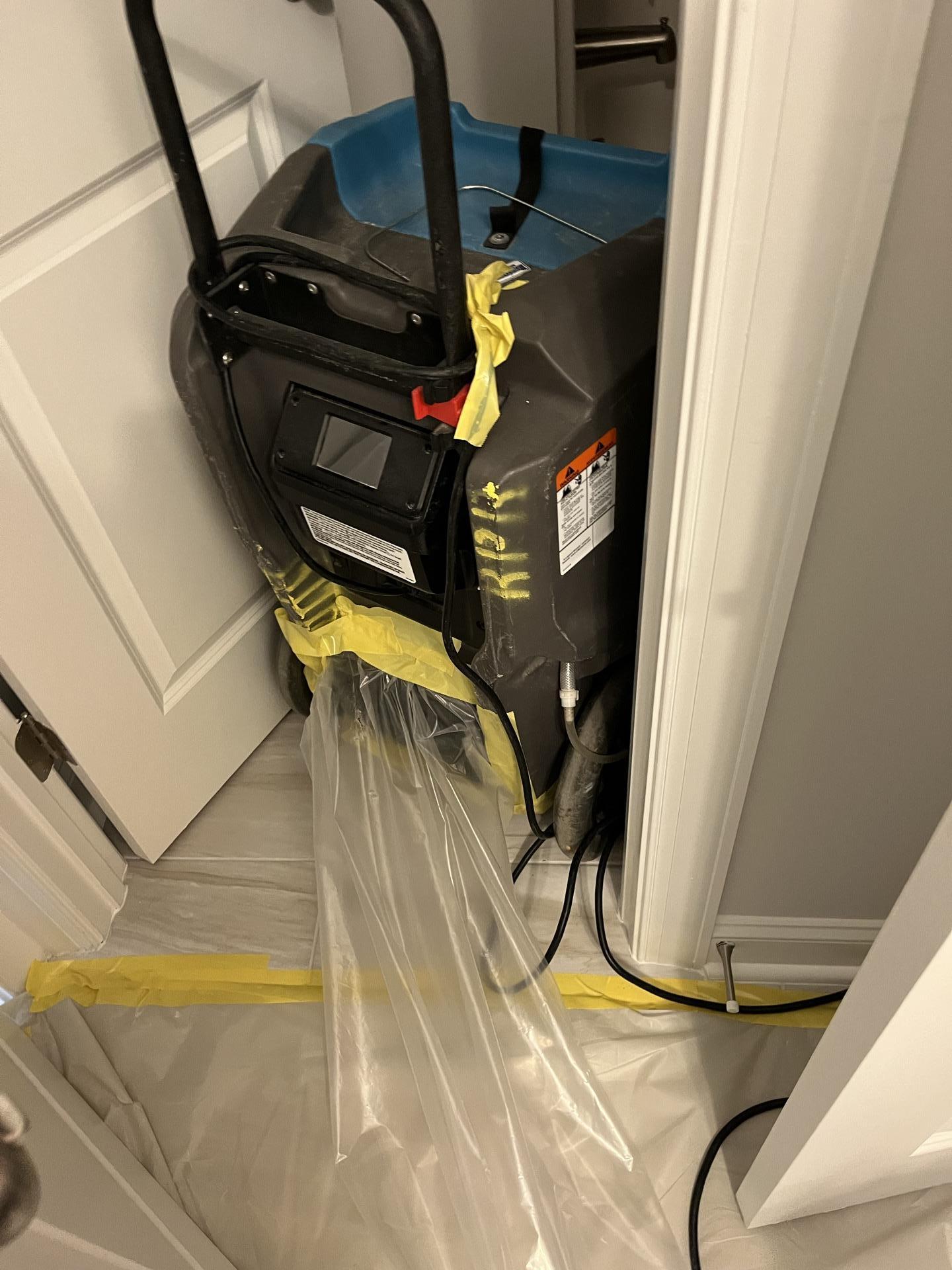 Professional water damage drying equipment, likely an air mover or dehumidifier, set up in a doorway between the 2nd-floor bathroom and foyer, taped for containment during remediation.