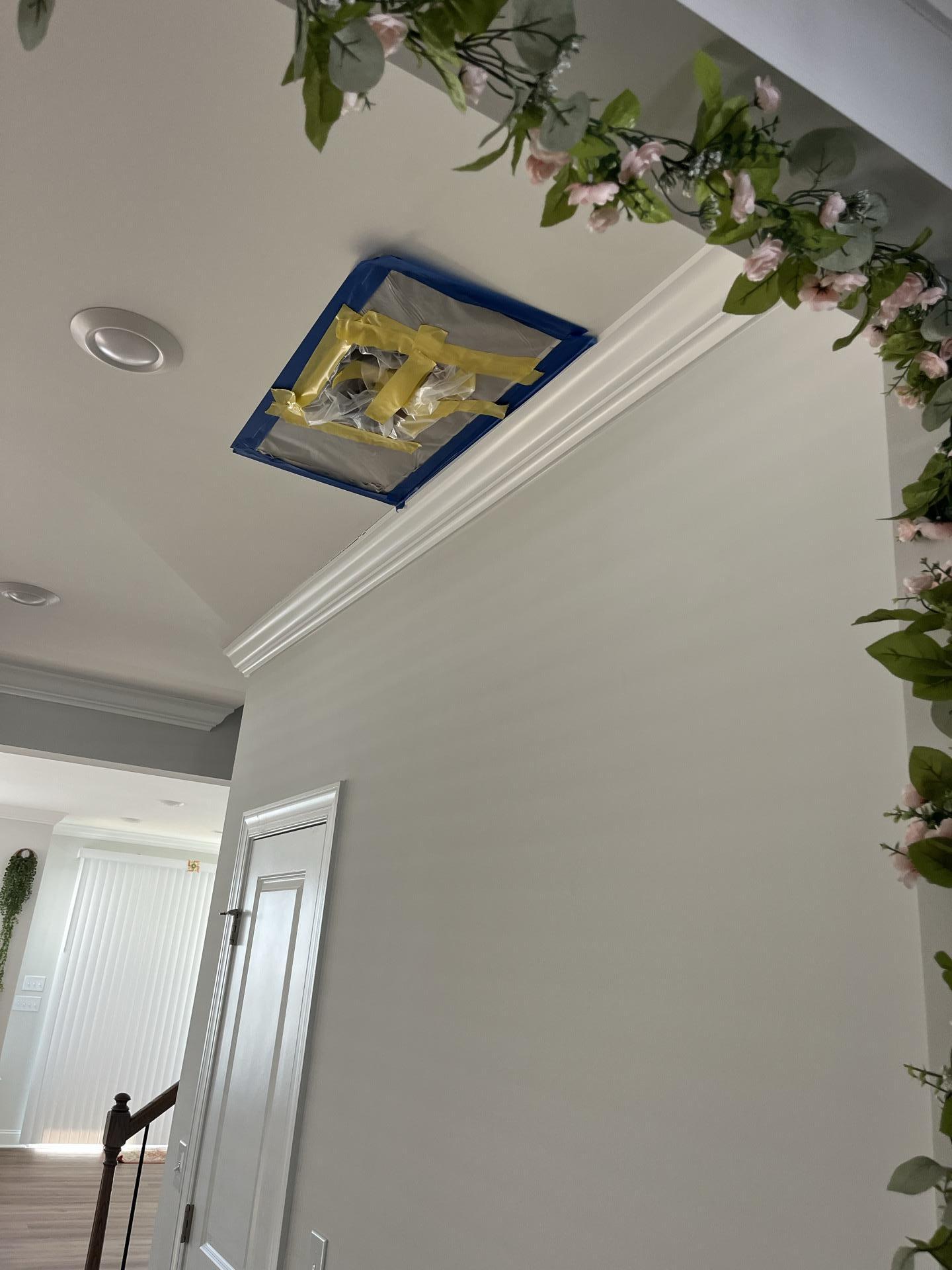 Taped and sealed access point in the ceiling of a foyer or hallway, indicating work performed for water damage remediation from an overhead source.