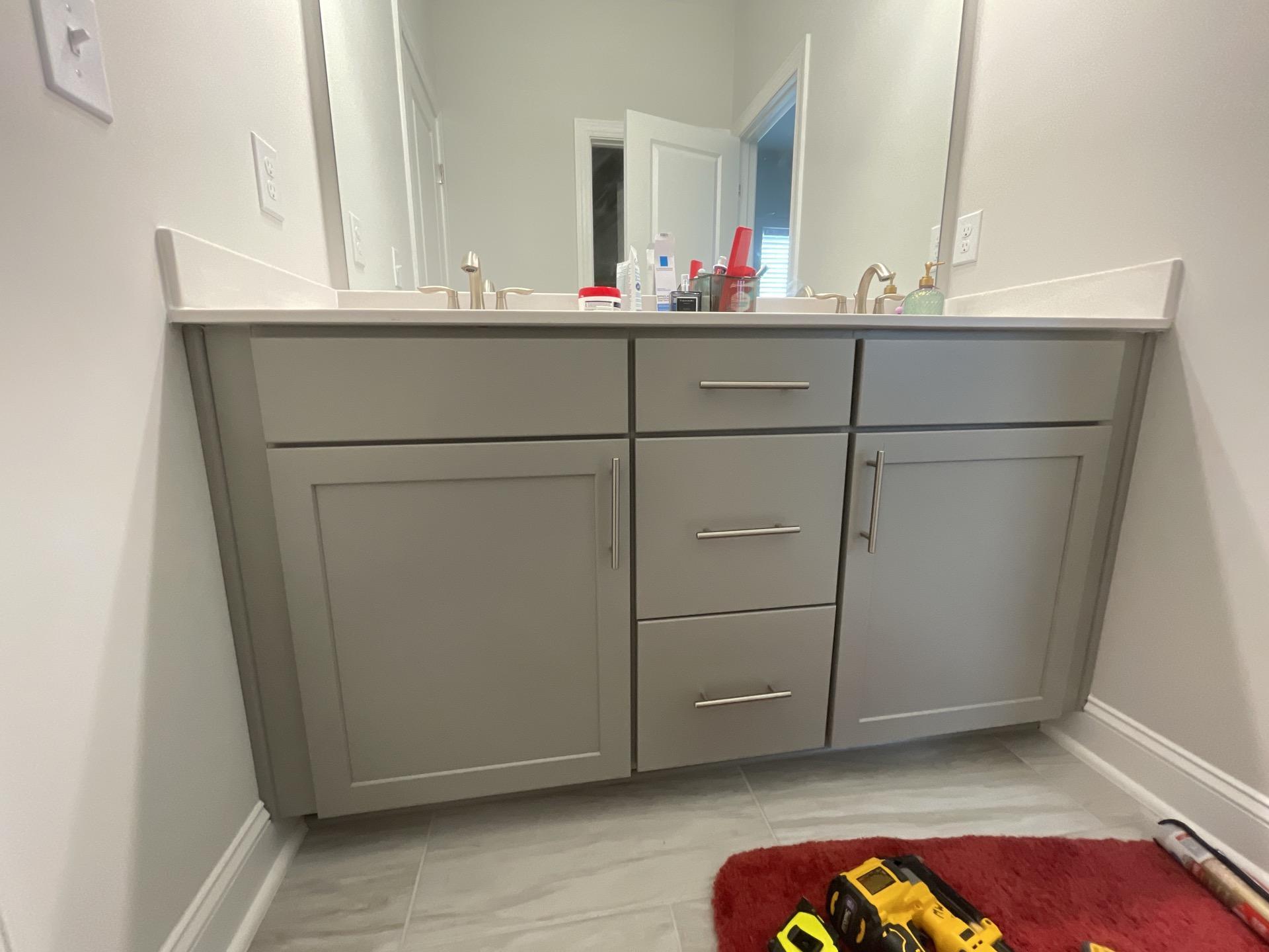 Restored and re-installed modern gray bathroom vanity with a white countertop and double sinks in a 2nd-floor bathroom after water damage services.