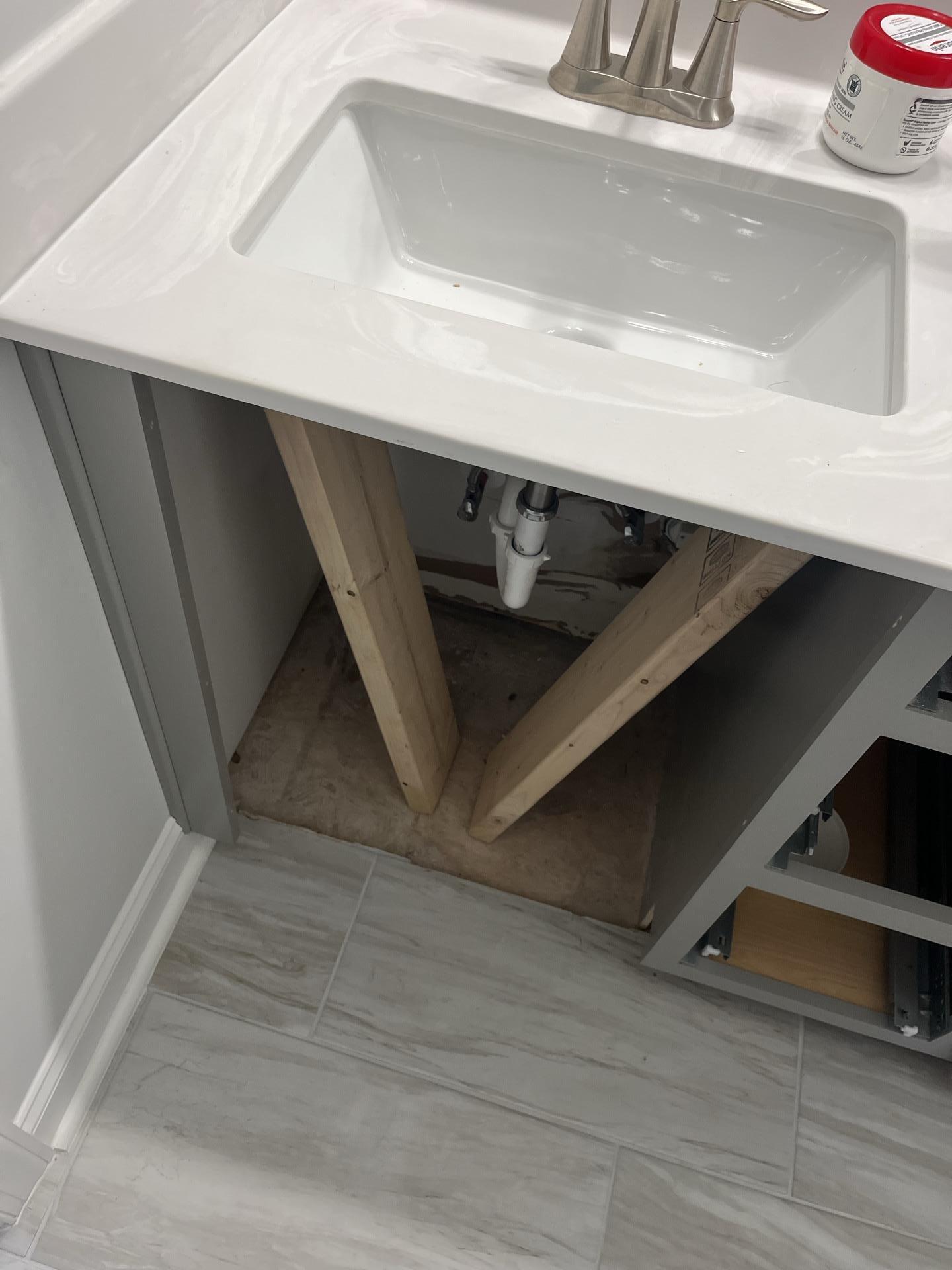 Underside of a bathroom vanity with temporary wooden supports and exposed subfloor, showing access for water damage repair in a 2nd-floor bathroom.