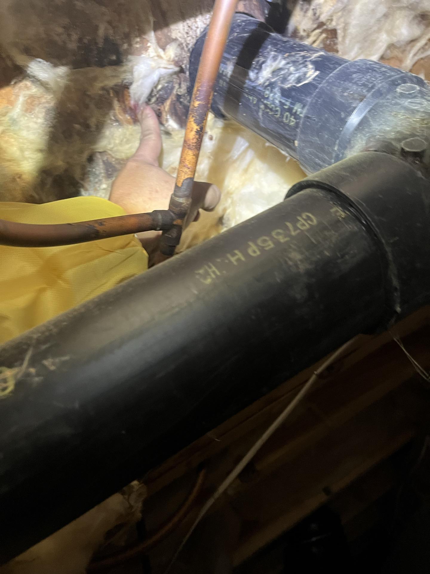 Close-up of plumbing pipes in the crawlspace, likely showing the identified source of the water damage.