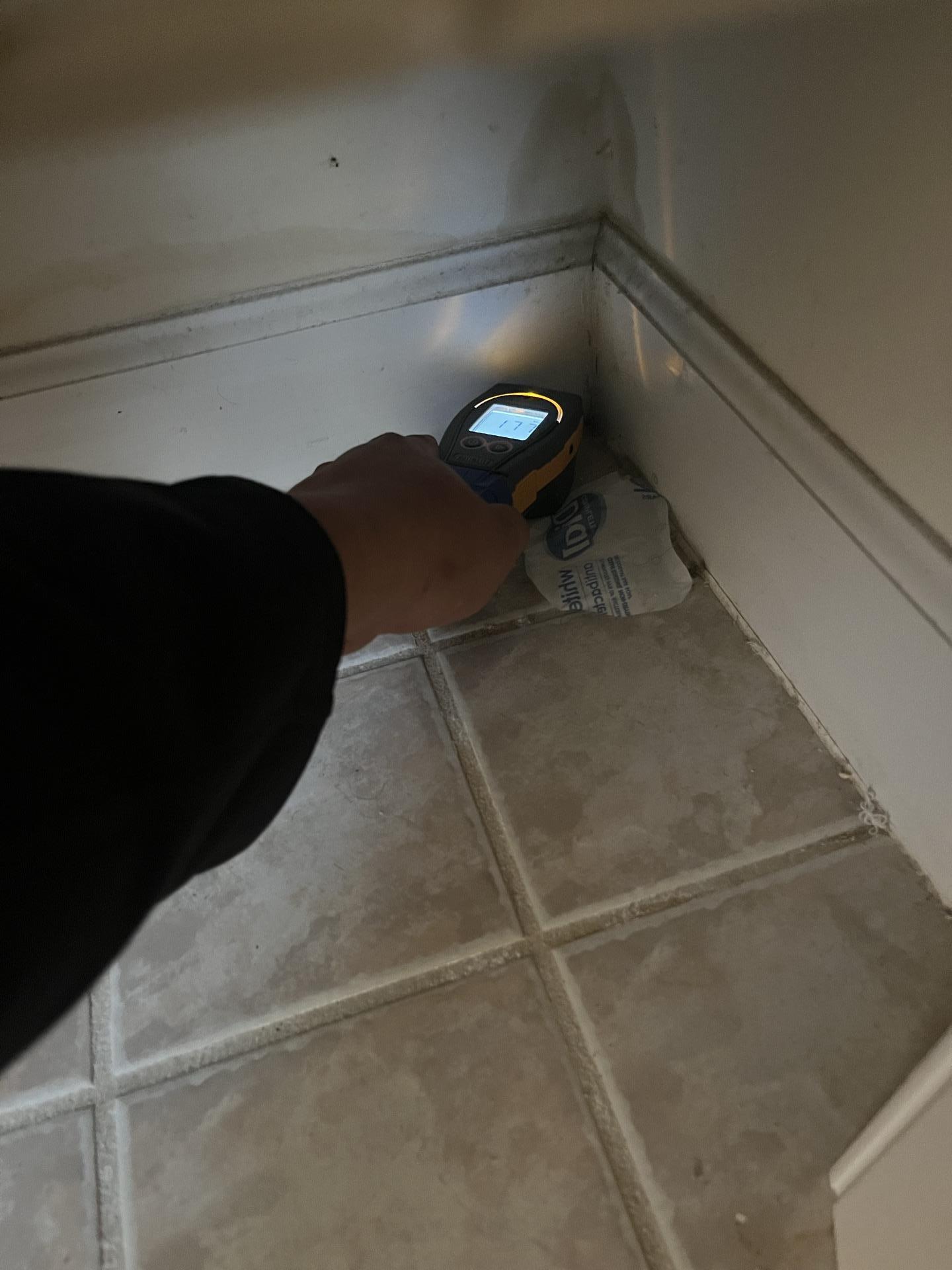 A technician using a moisture meter to detect water damage near a baseboard in the affected area of a master bathroom closet.