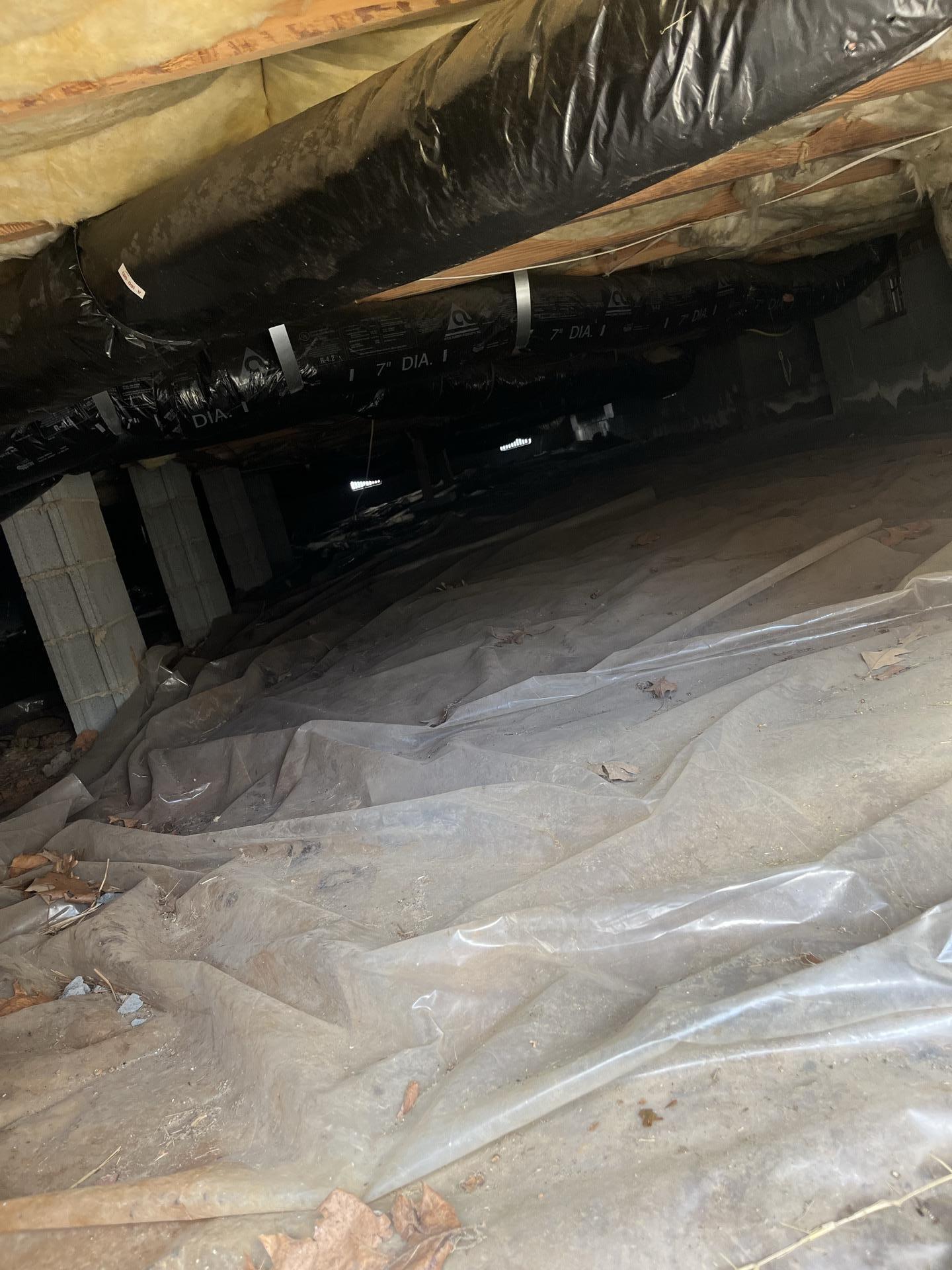 An image showing the crawlspace with a vapor barrier and insulation, where water damage inspection and remediation services were performed.