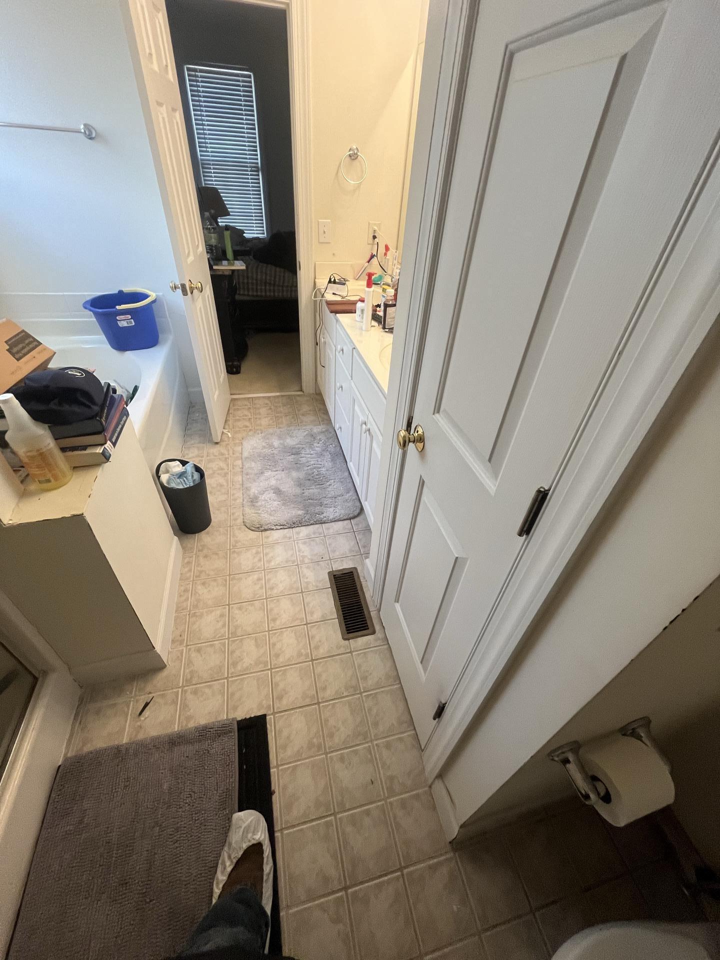 Overview of a master bathroom, indicating an area where water damage assessment was performed near the closet.