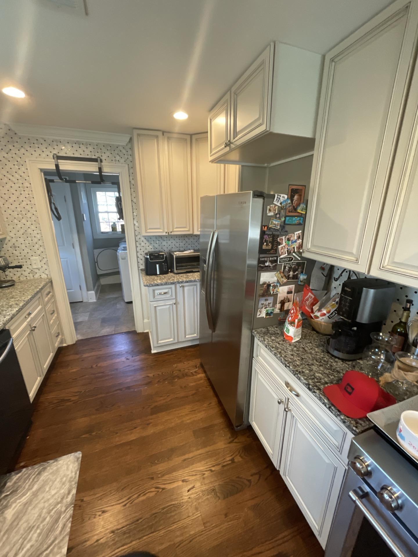 Another perspective of the kitchen area with a stainless steel refrigerator and white cabinetry, inspected for moisture by RestorePro Restoration.