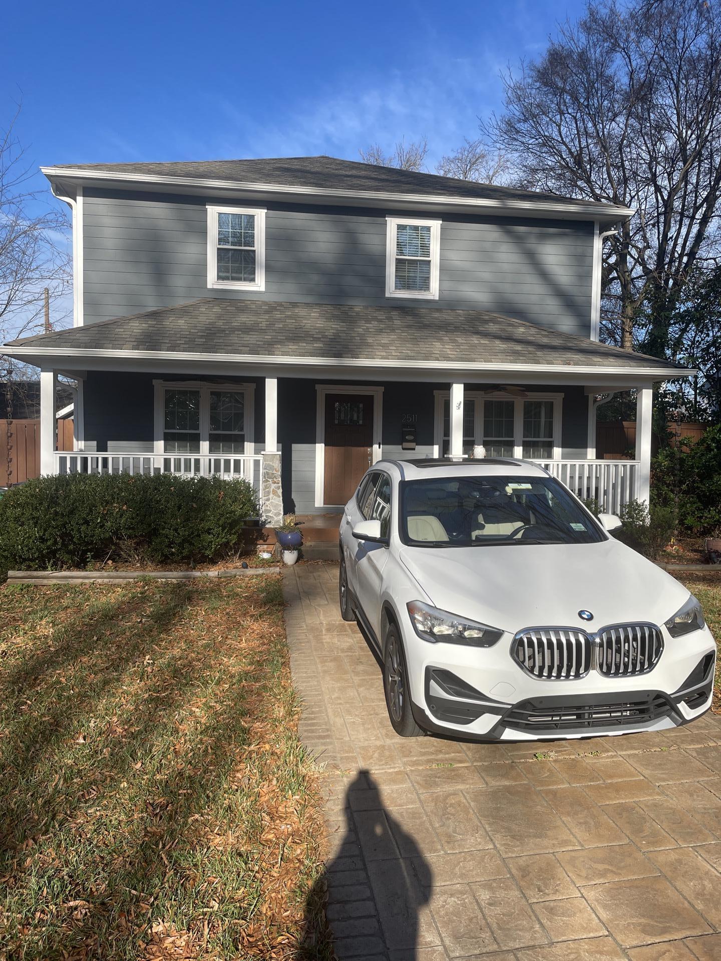 Exterior view of a grey two-story house with a white BMW parked in the driveway, where RestorePro Restoration conducted a moisture check.