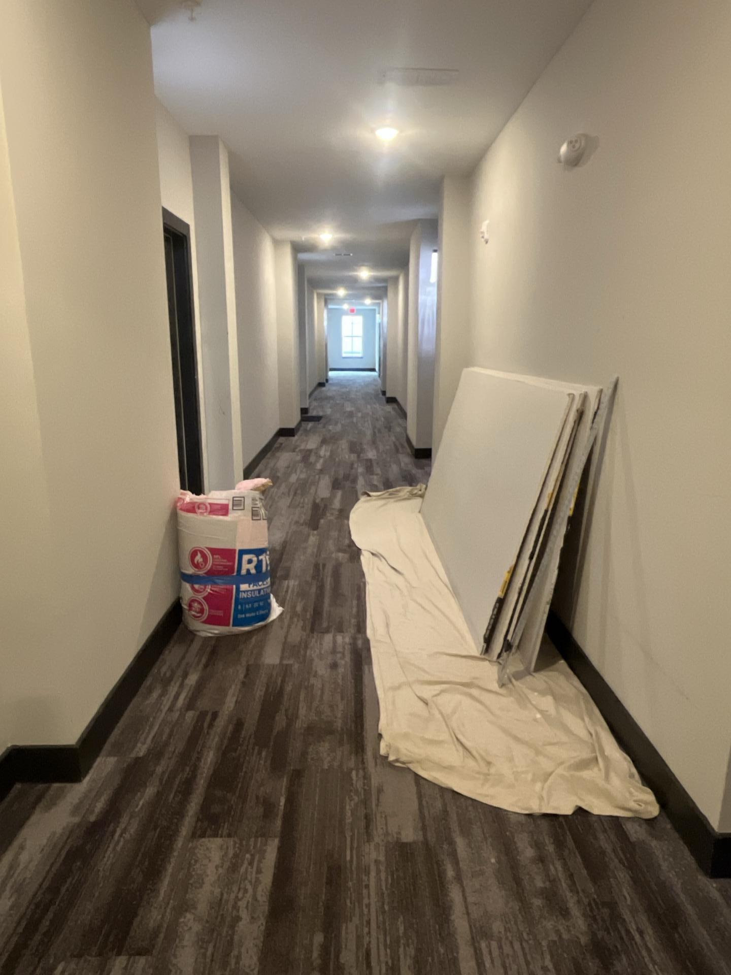 Hallway in an apartment building with drywall sheets and insulation bags prepared for installation during a restoration project.