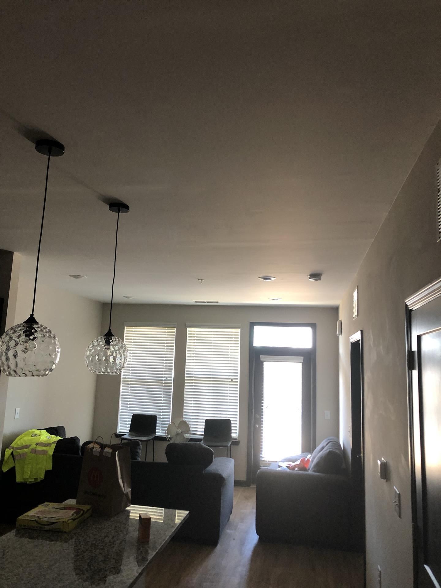 Fully restored living room with newly painted walls and ceiling, modern light fixtures, and a clean, refreshed appearance after extensive drywall and paint work.