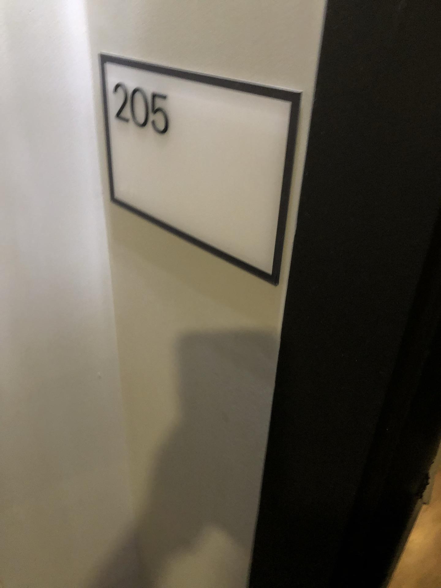 Close-up of apartment unit number 205, indicating the specific location where the restoration and repair work took place.