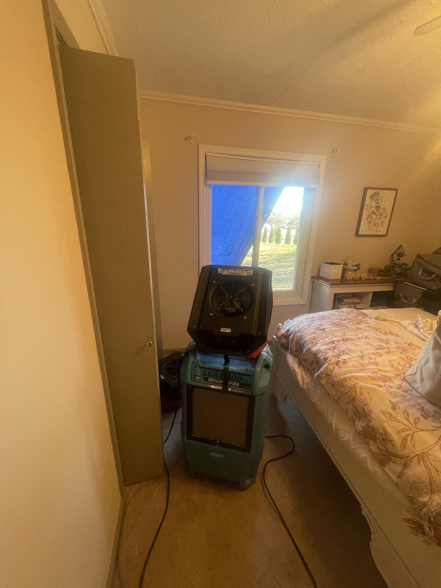Upon arrival, technicians conducted a thorough moisture assessment in the bedroom, identifying elevated moisture levels in the walls and ceiling using a professional moisture meter. To address the moisture, commercial-grade drying equipment, including a high-capacity dehumidifier and an air mover, was strategically placed in the bedroom to facilitate the drying process. The area was contained and dried to prevent further damage and ensure complete moisture removal.