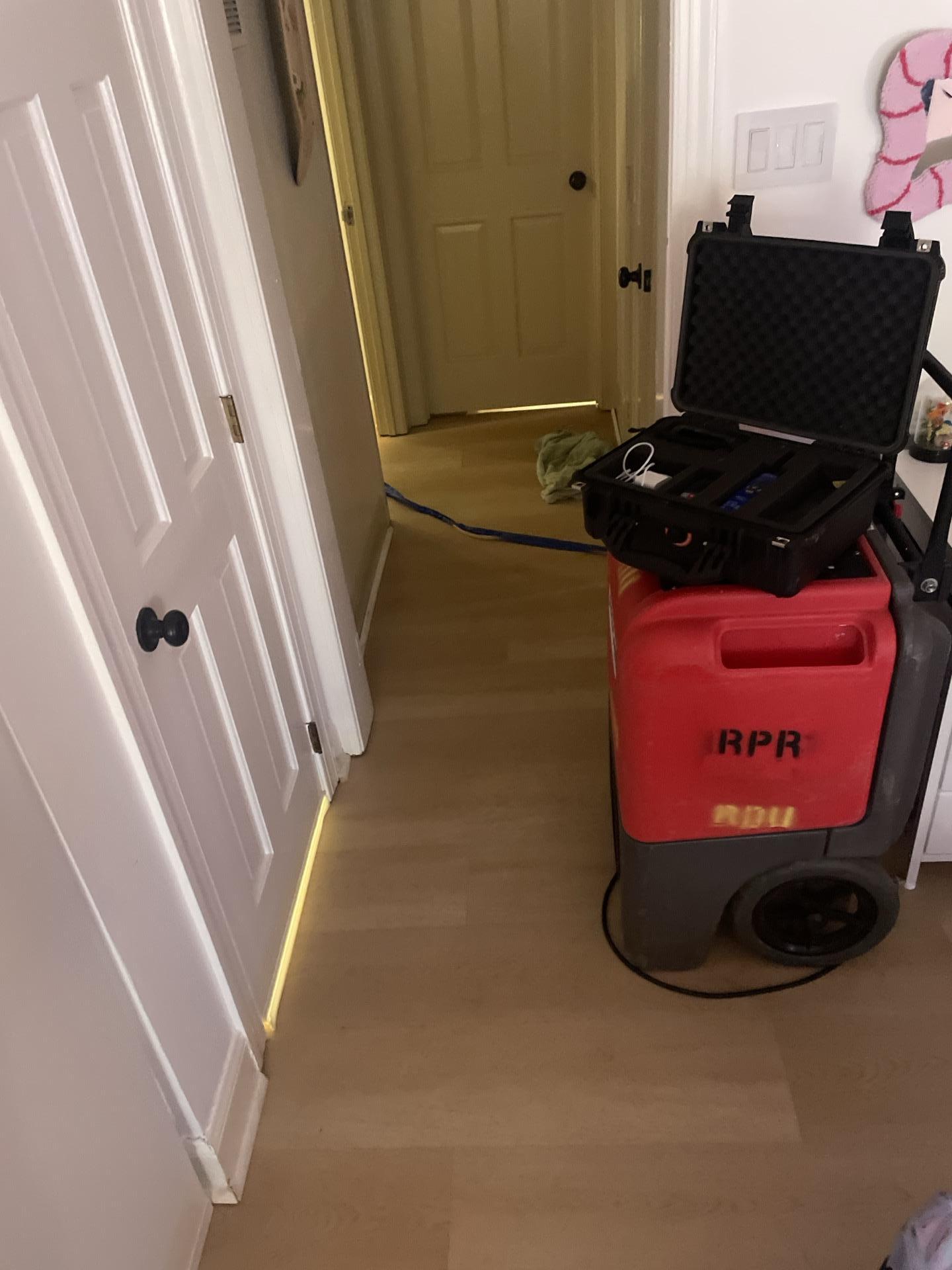 Hallway with a red 'RPR' industrial air mover, indicating water damage restoration work in progress.