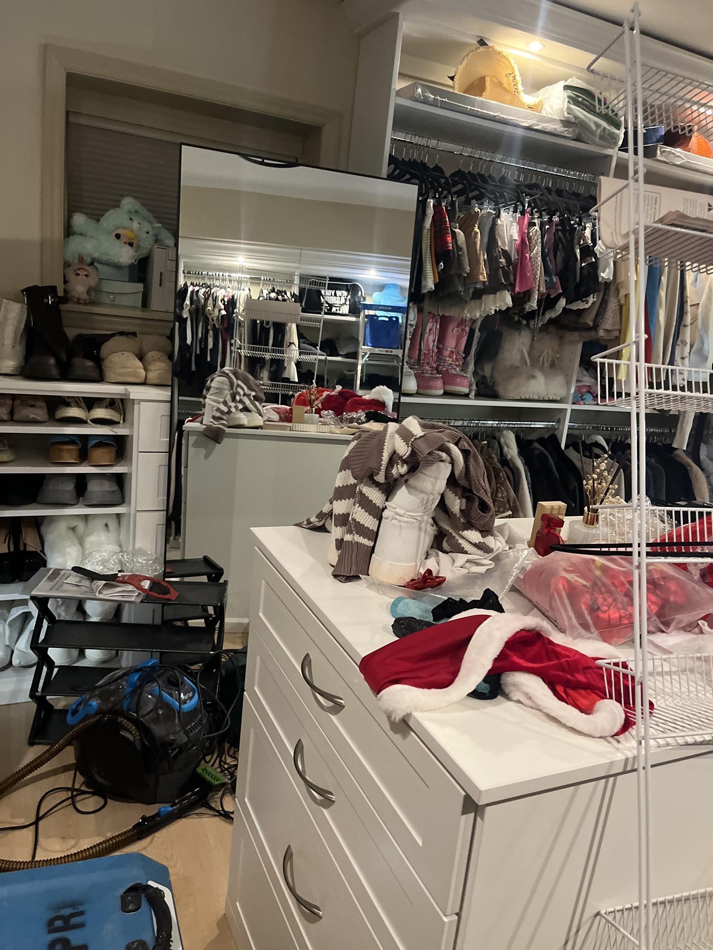 Water damage restoration equipment in a female walk-in closet, with clothes and shoes organized around a drying machine.