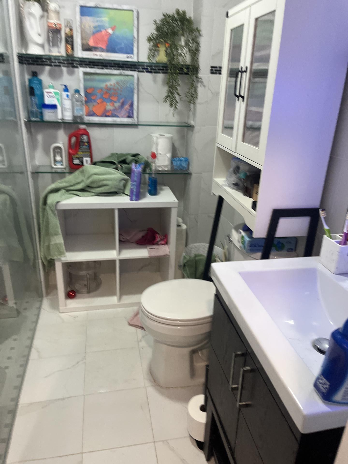 Bathroom with a toilet, vanity, and shower, prepared for or undergoing water damage restoration.