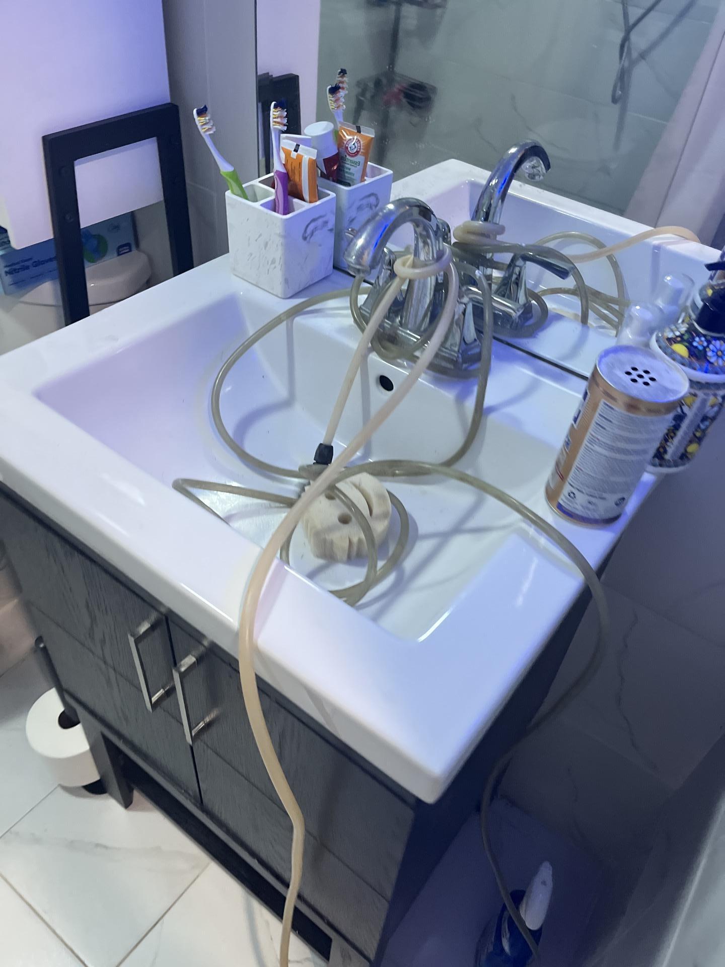 Bathroom sink with tubing, possibly for water extraction or drying, during a water damage restoration service.
