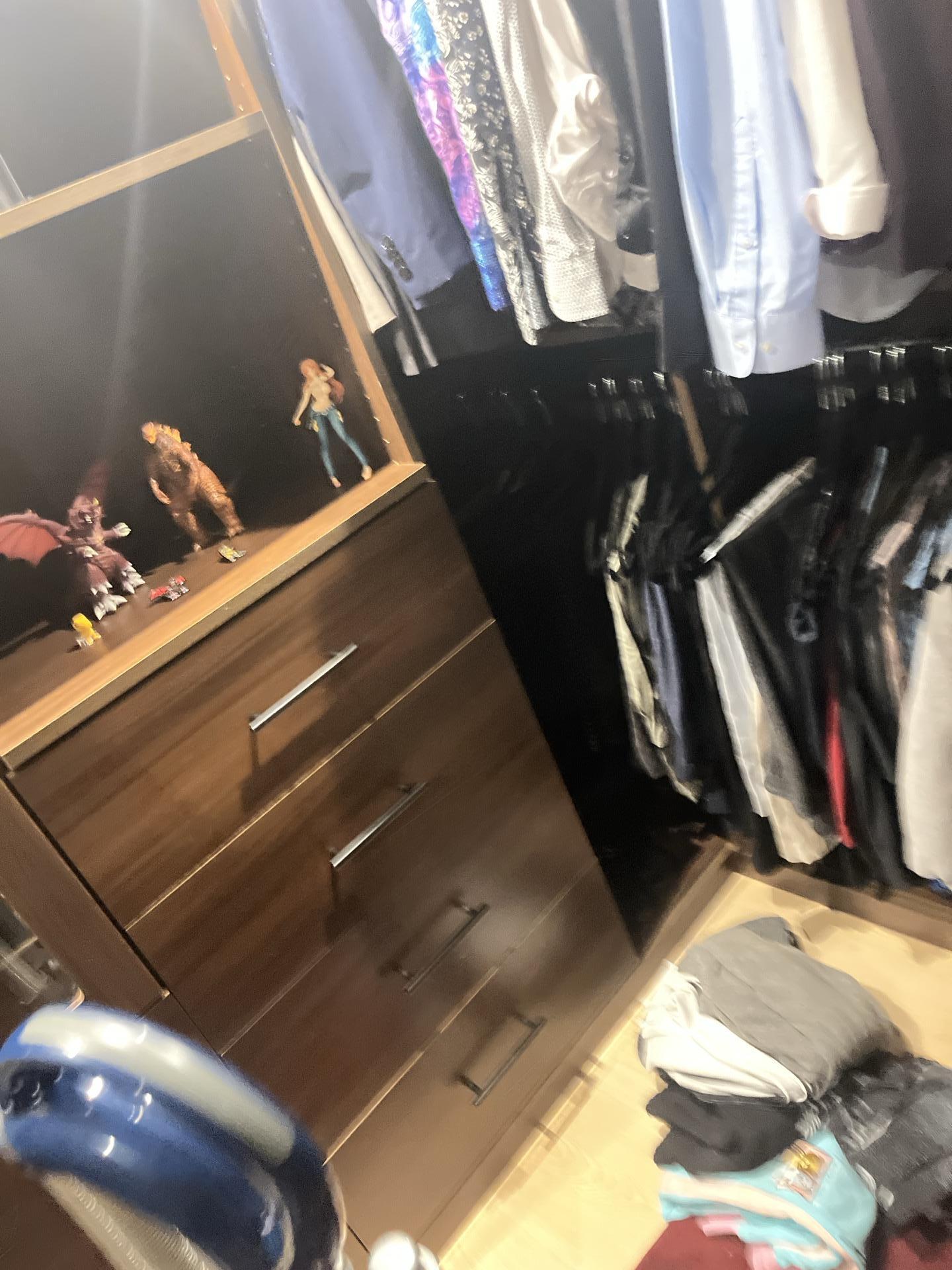 Interior of a male wardrobe with clothes hanging and a partial view of restoration equipment during water damage cleanup.