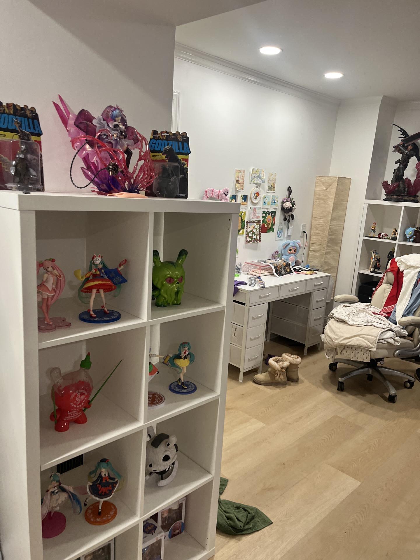 A living room or multi-purpose room showing shelves with collectibles and a desk, indicating a room undergoing the drying process during restoration.