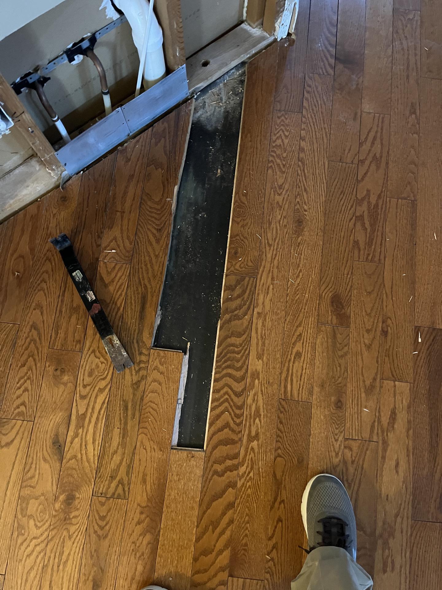 RestorePro Restoration provided comprehensive water damage restoration services. This involved identifying the source of the water intrusion by opening up the affected wall section to expose and address the plumbing, and carefully removing damaged hardwood flooring to facilitate drying and remediation of the subfloor.