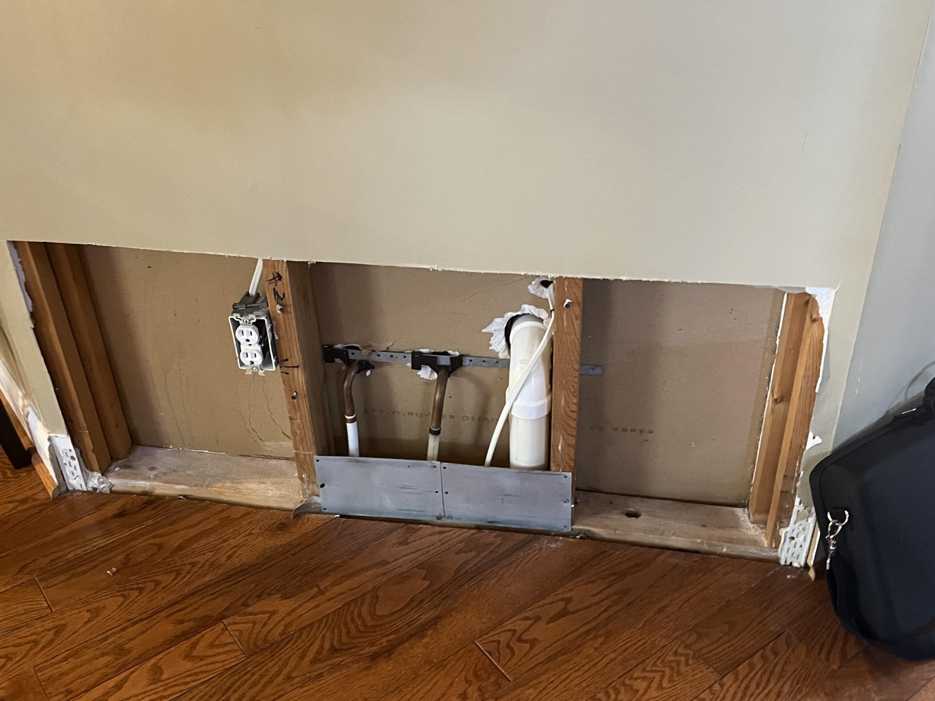 Opened wall cavity revealing plumbing pipes and electrical outlets, indicating the area of water damage and leak source.