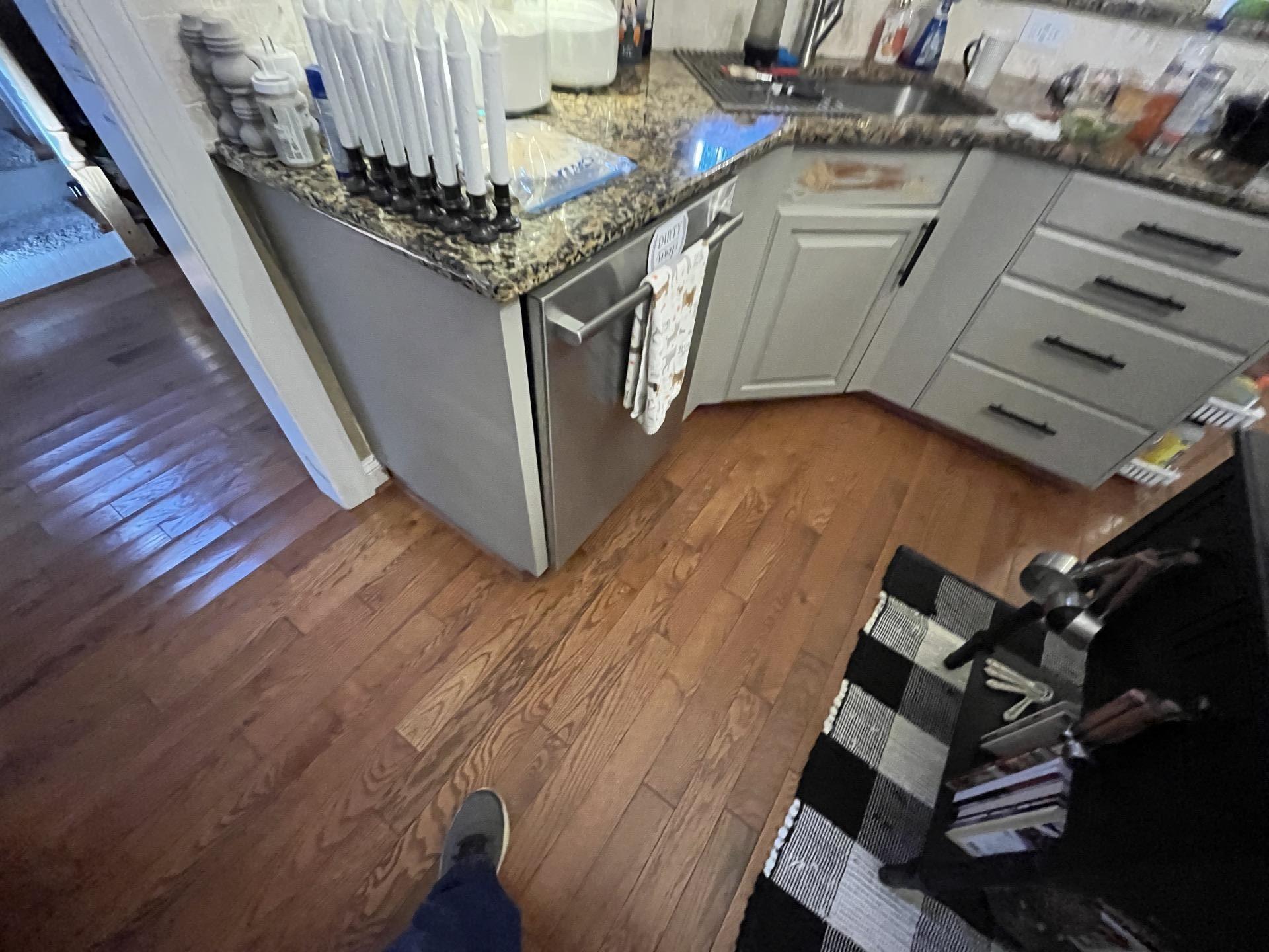 The customer experienced significant water damage in their kitchen area, likely due to a plumbing issue behind a wall, which resulted in damage to both the wall structure and the hardwood flooring.