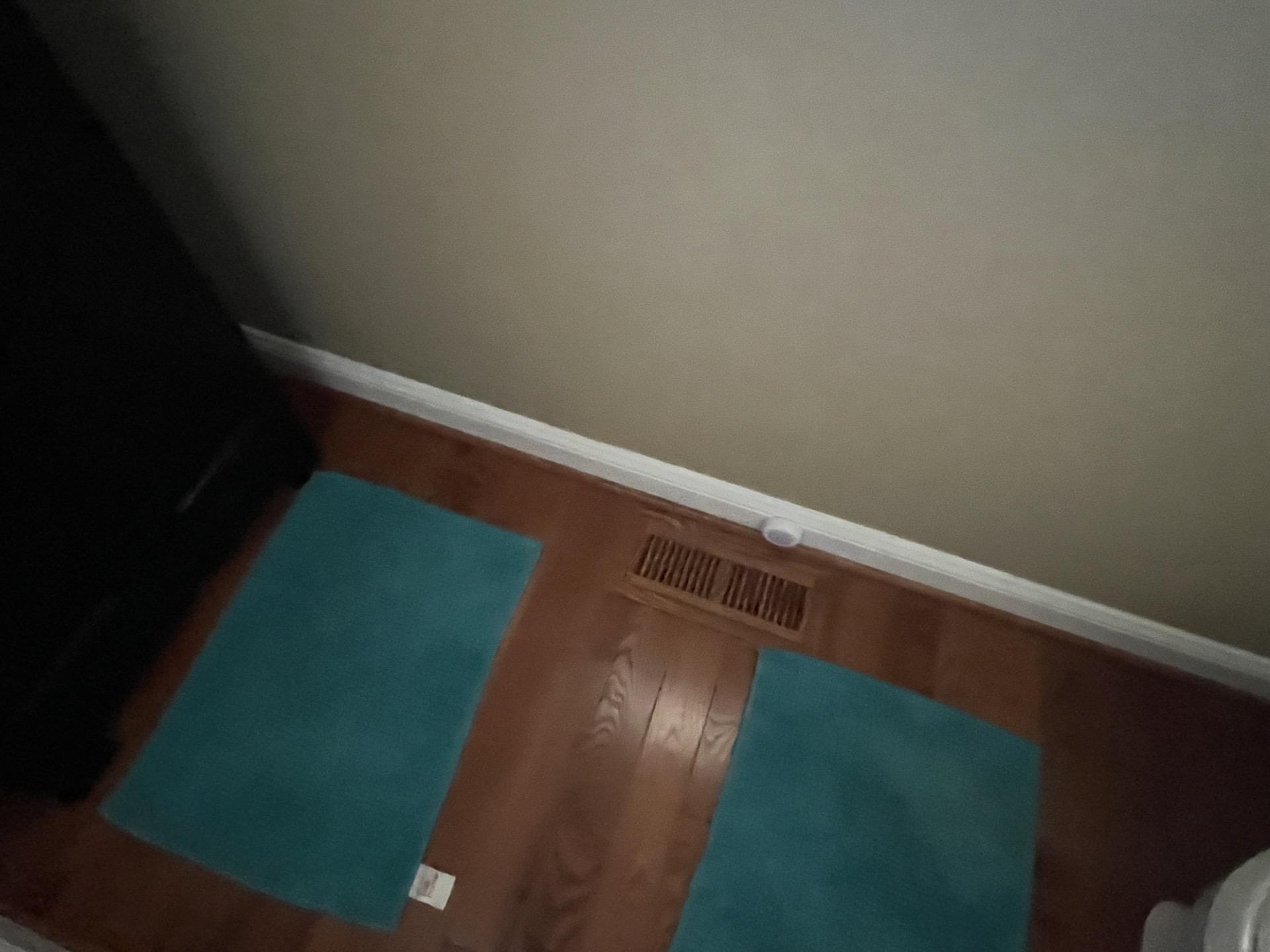Hardwood floor with a wall vent and two blue bath mats, showing a corner of the affected or nearby room.