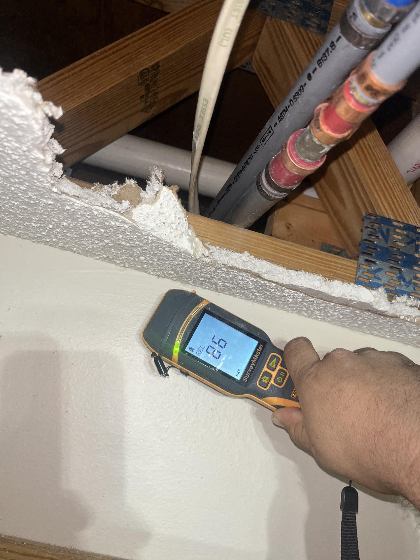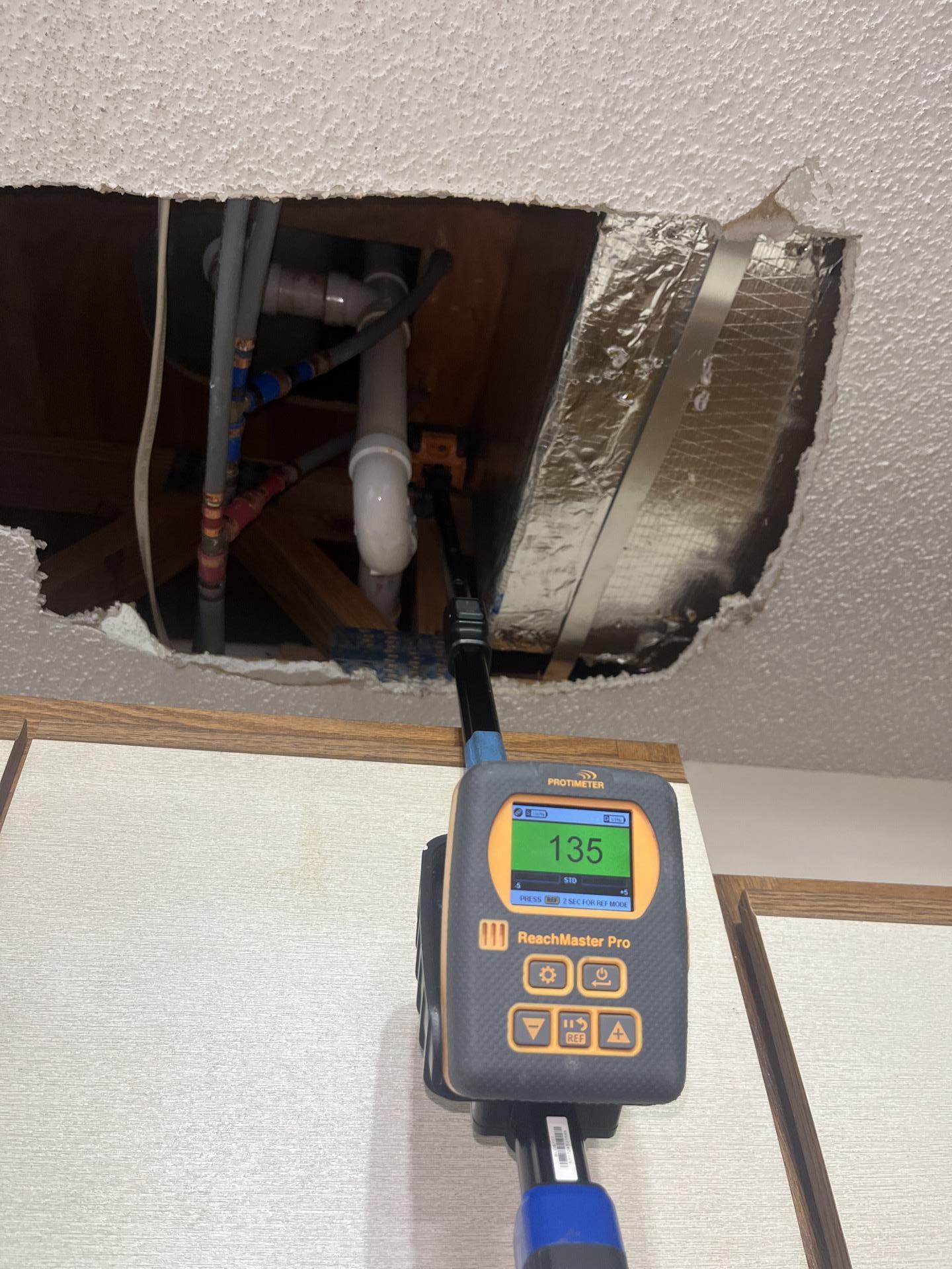 Water damage inspection and restoration services were provided. This included detailed moisture detection in the affected kitchen ceiling and surrounding areas using specialized moisture meters. The master bedroom was also thoroughly checked for moisture, confirming it was unaffected. Remediation efforts for the identified water damage were initiated to restore the property.
