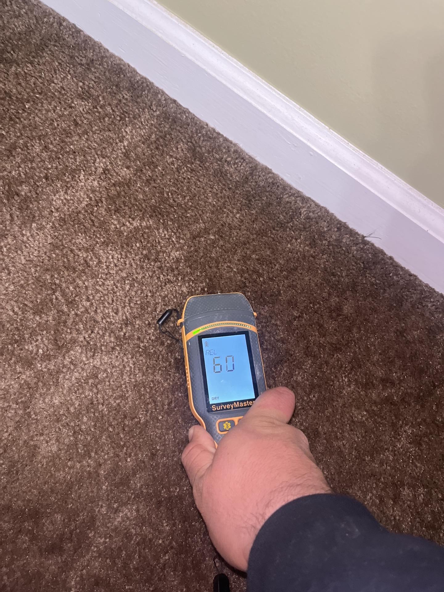 Close-up of a SurveyMaster moisture meter displaying a reading of 60 on brown carpet, indicating significant moisture present in the flooring.