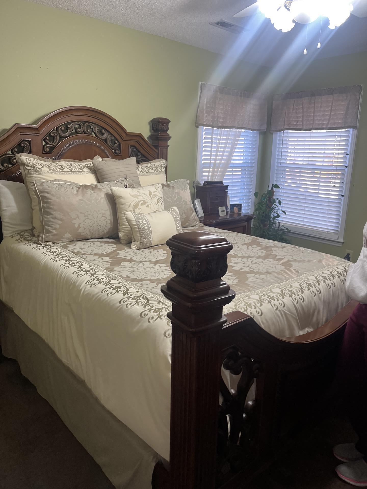 A well-appointed master bedroom, confirmed to be unaffected by water damage, showcasing a large wooden bed and elegant decor.