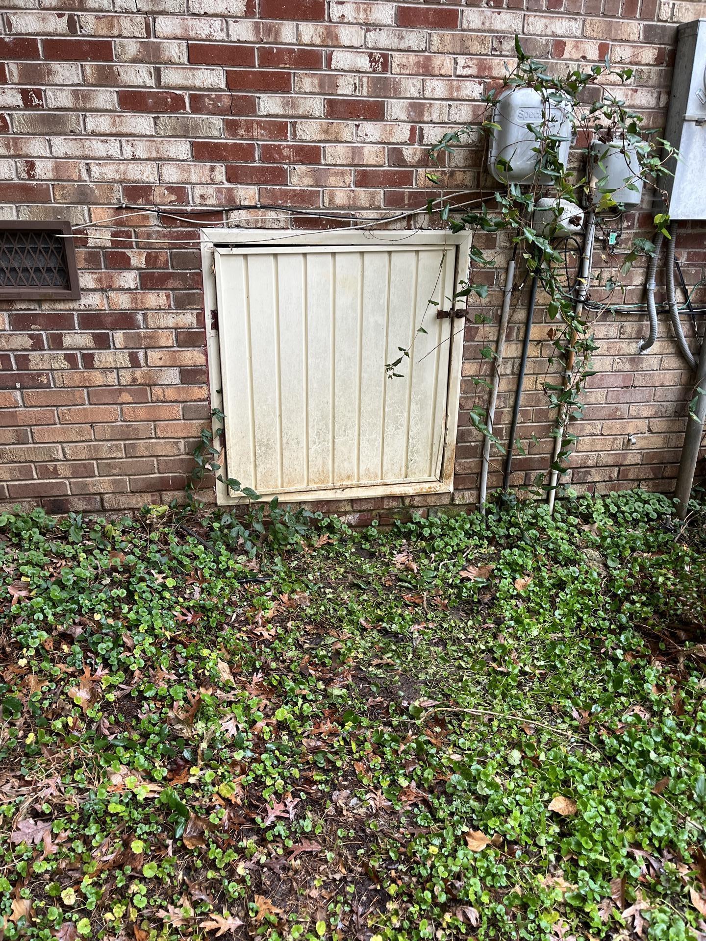 Exterior view of a brick house showing the metal crawlspace access door, providing context to the property location.