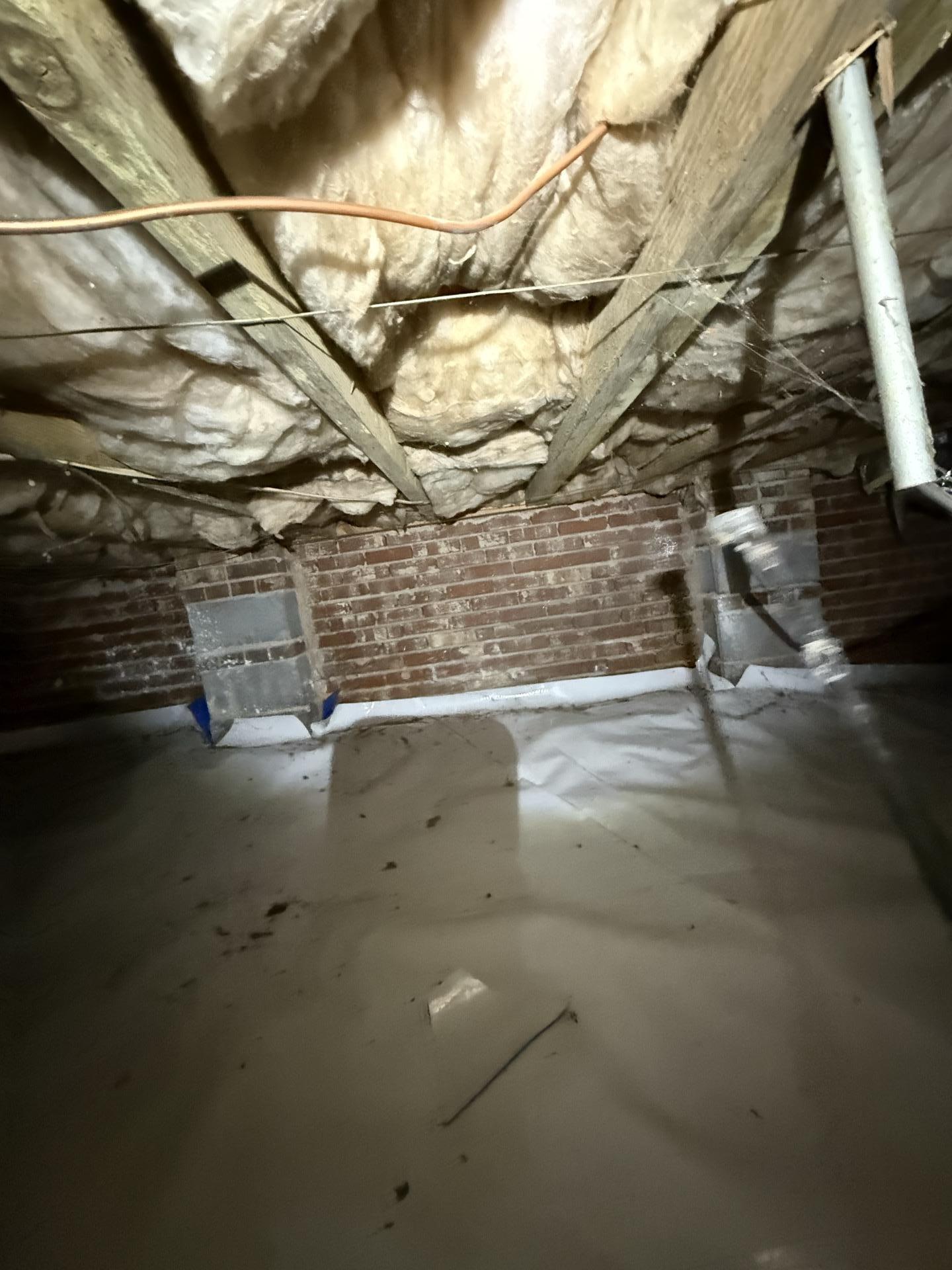 A fully restored and encapsulated crawlspace featuring a clean, new white vapor barrier, clear brick walls, and insulation, showcasing successful water damage remediation.