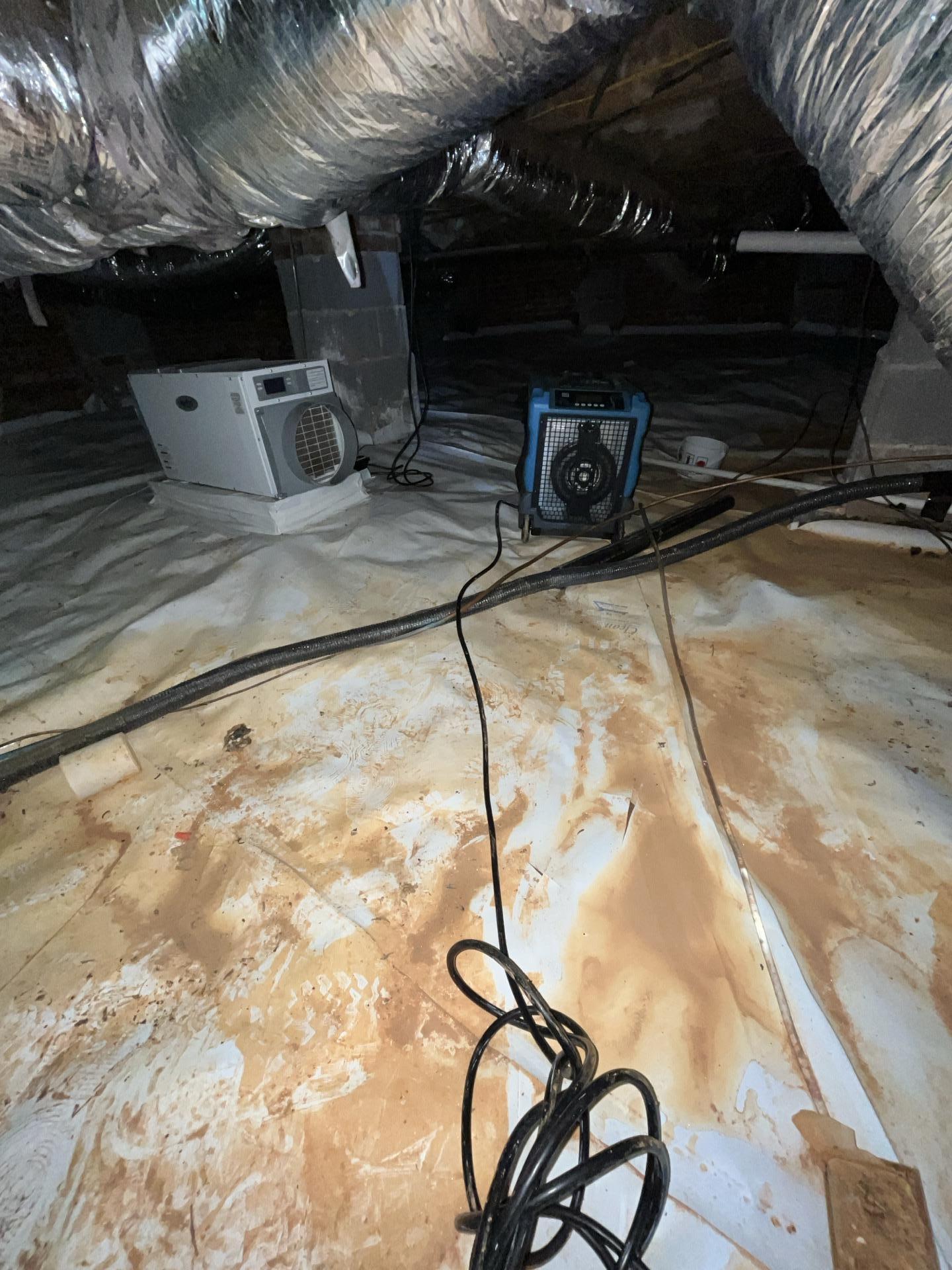 Professional drying equipment, including a dehumidifier and air mover, working in a crawlspace with a new, partially soiled vapor barrier during the drying process.