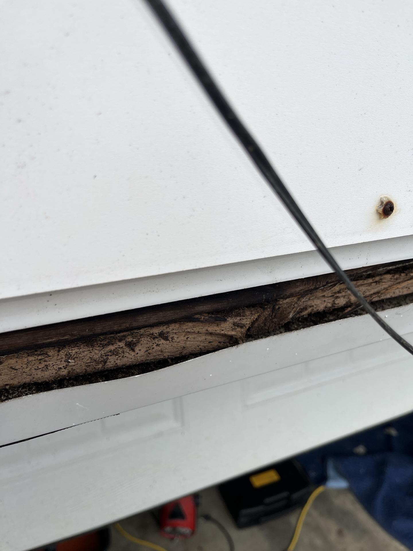 Close-up detail of severely water-damaged and rotten wood on a garage door frame.