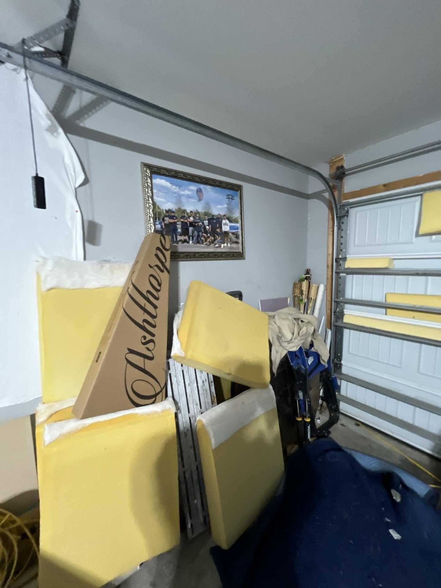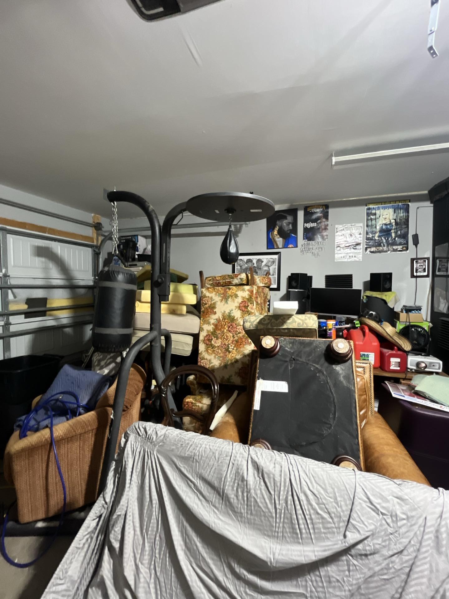 Interior of a garage with various contents, including cushions and furniture, strategically moved for water damage remediation access.