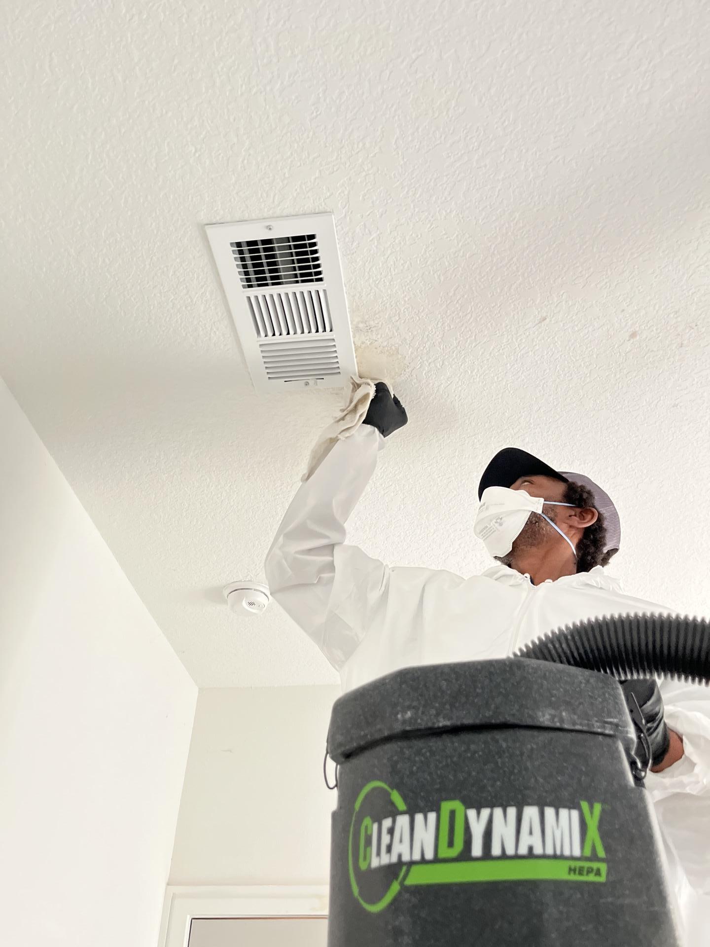 Restoration technician in full PPE using a HEPA vacuum to clean a ceiling vent, indicating professional mold remediation or air duct cleaning services.