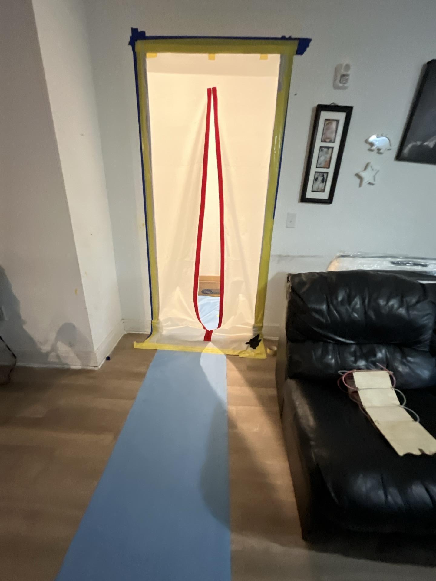 Plastic containment barrier with a zippered entry taped to a doorway, used to isolate contaminated areas during mold remediation.