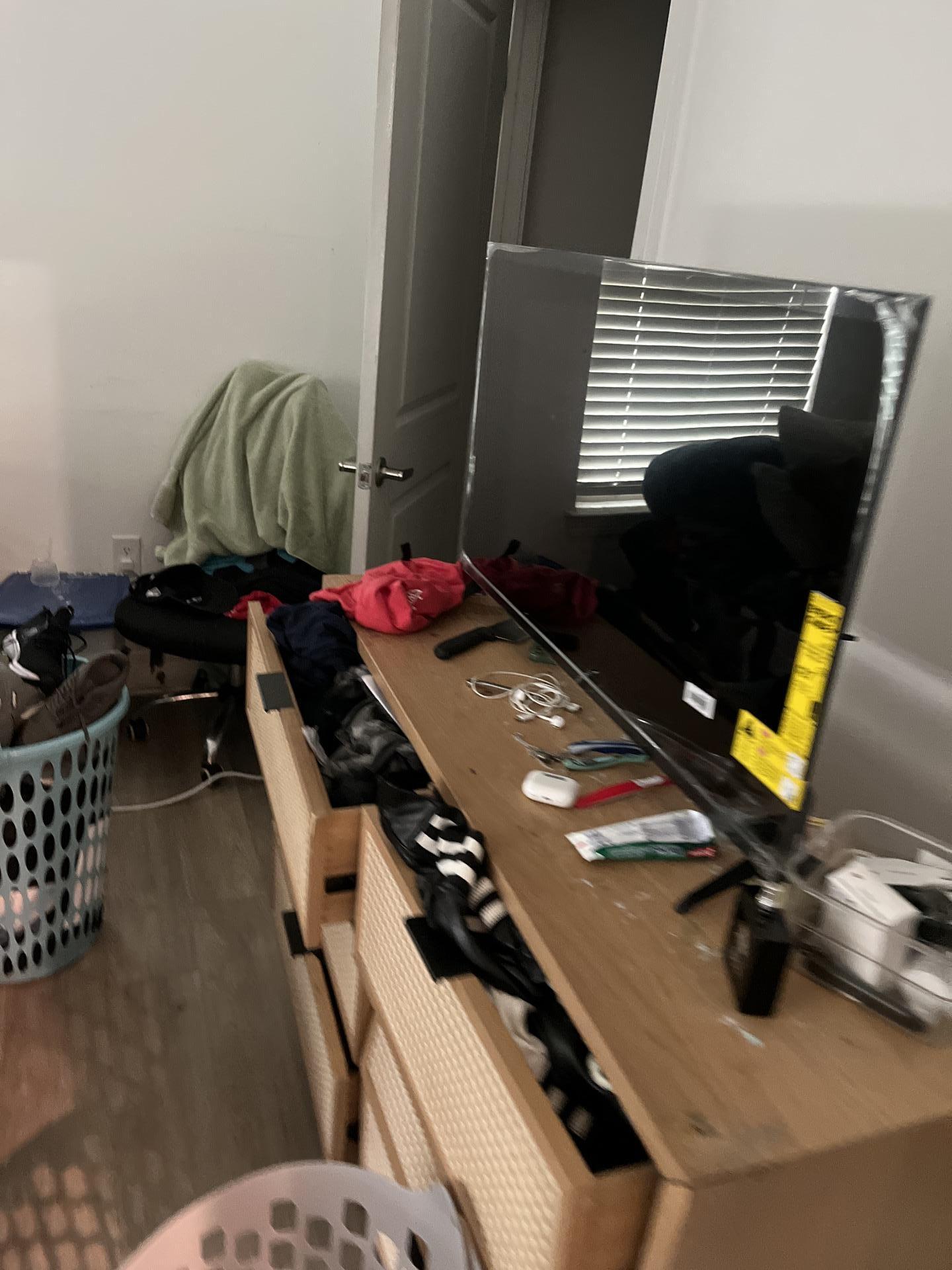 Cluttered room before restoration showing a dresser, television, and laundry basket, indicating the need for professional cleanup or mold remediation.
