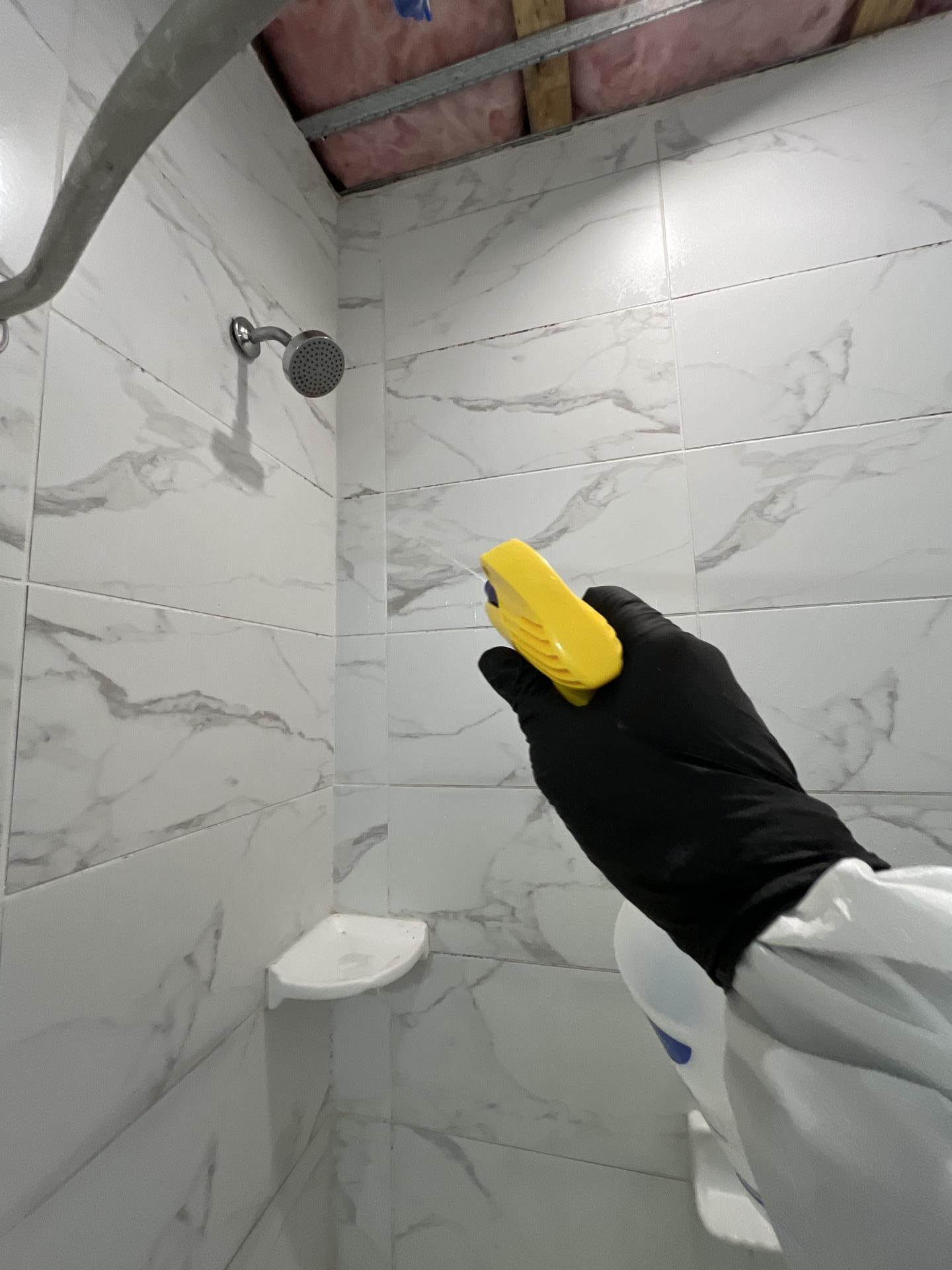 Professional in black glove applying treatment to white tiled shower walls, with exposed ceiling insulation above, during a mold remediation service.