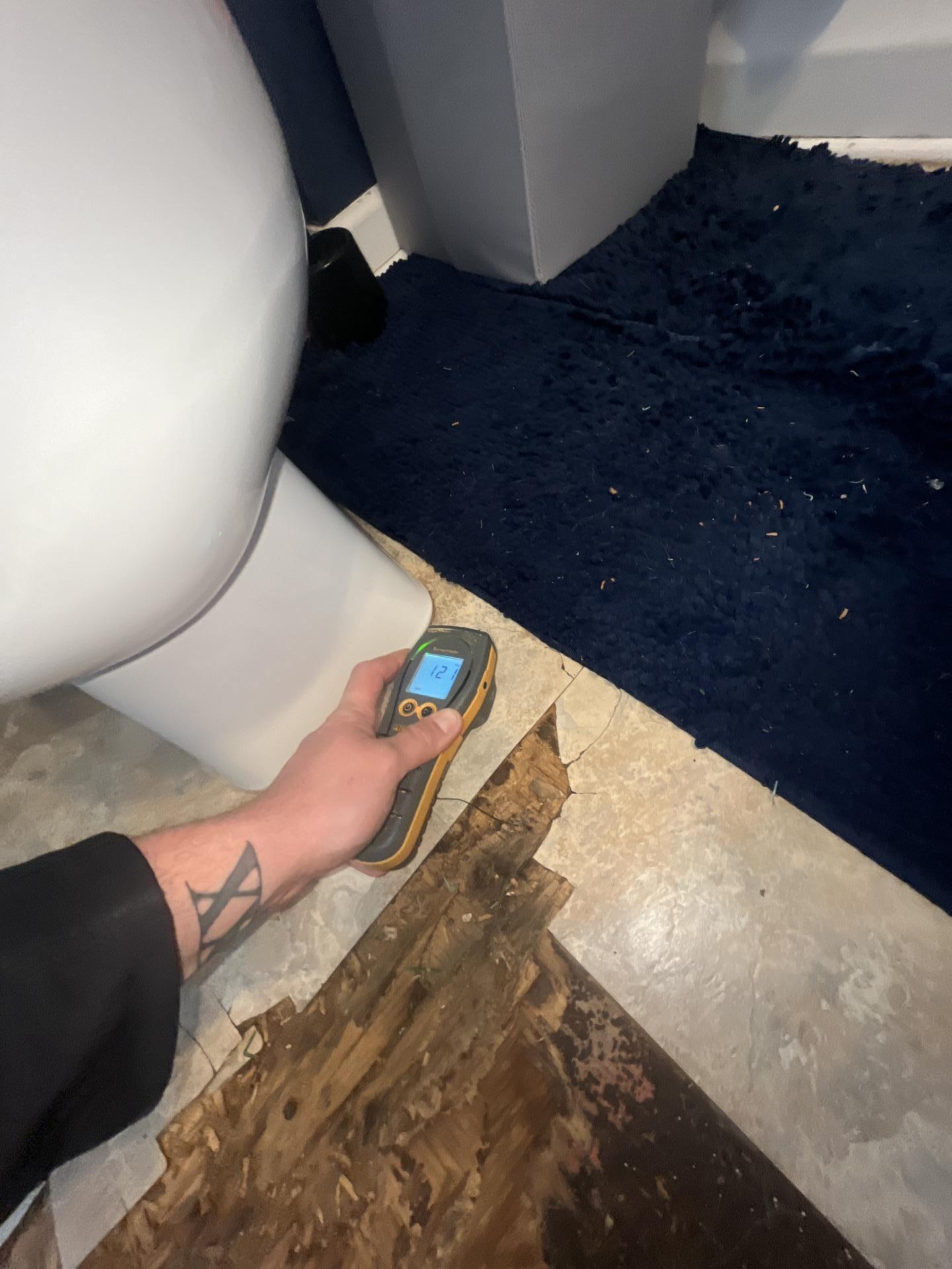 A technician's hand holding a moisture meter to assess water saturation levels on the damaged bathroom floor near the base of the toilet.