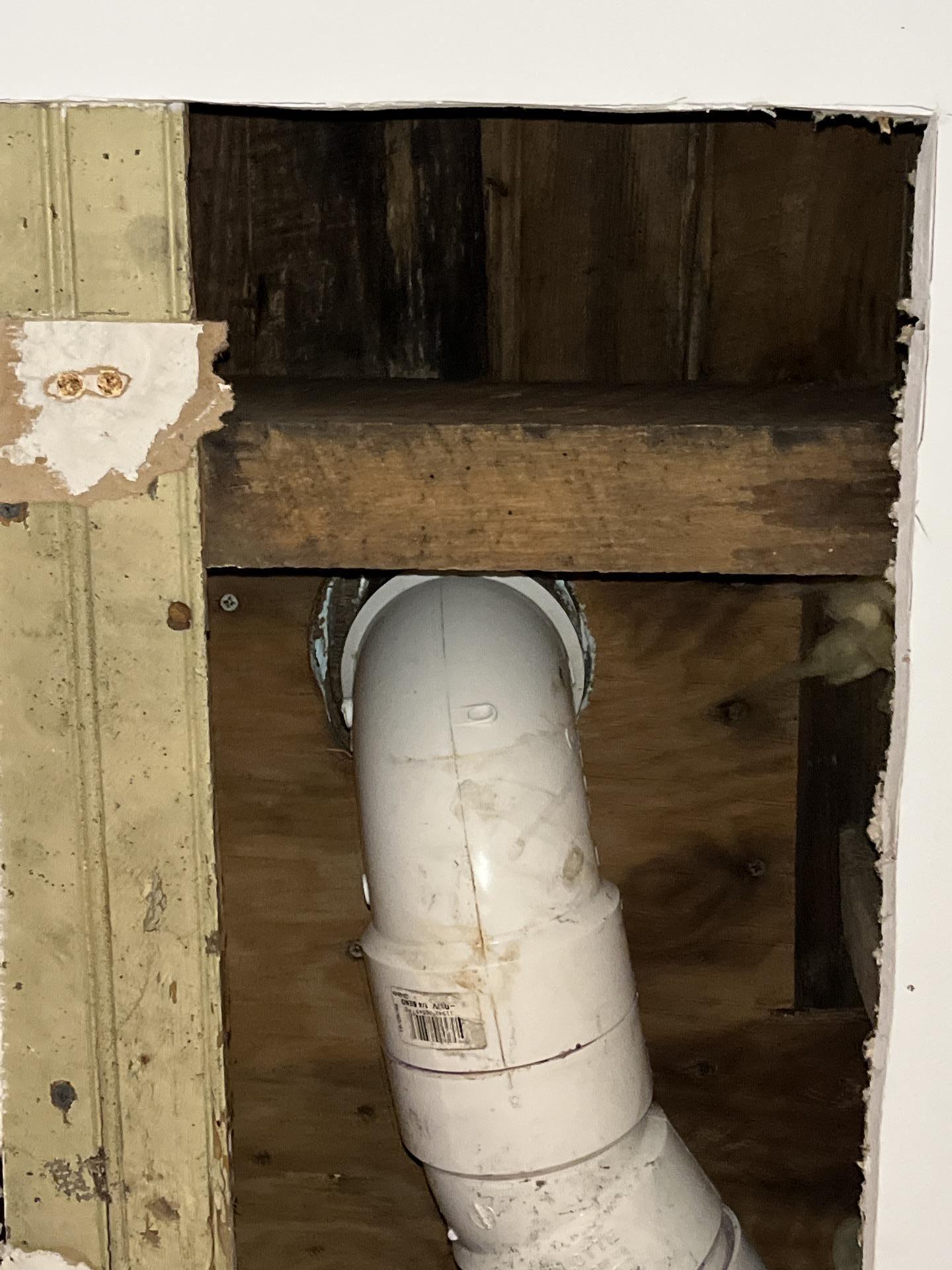 A view into an opening in the bathroom floor, showing a white PVC plumbing pipe and wooden structural elements, part of the water damage inspection.