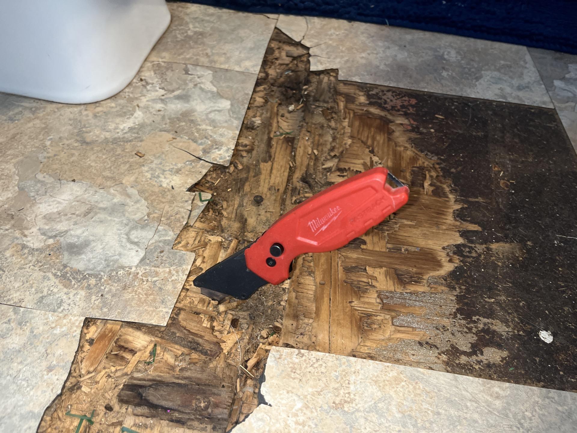 A red utility knife resting on the extensively water-damaged bathroom floor and exposed subfloor, indicating active demolition work.