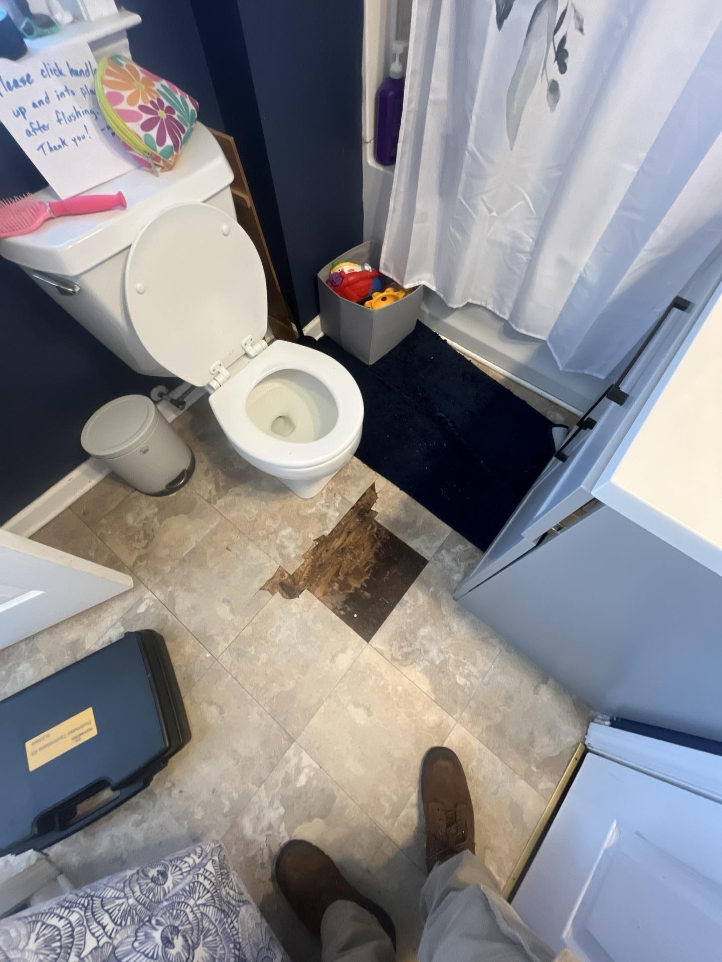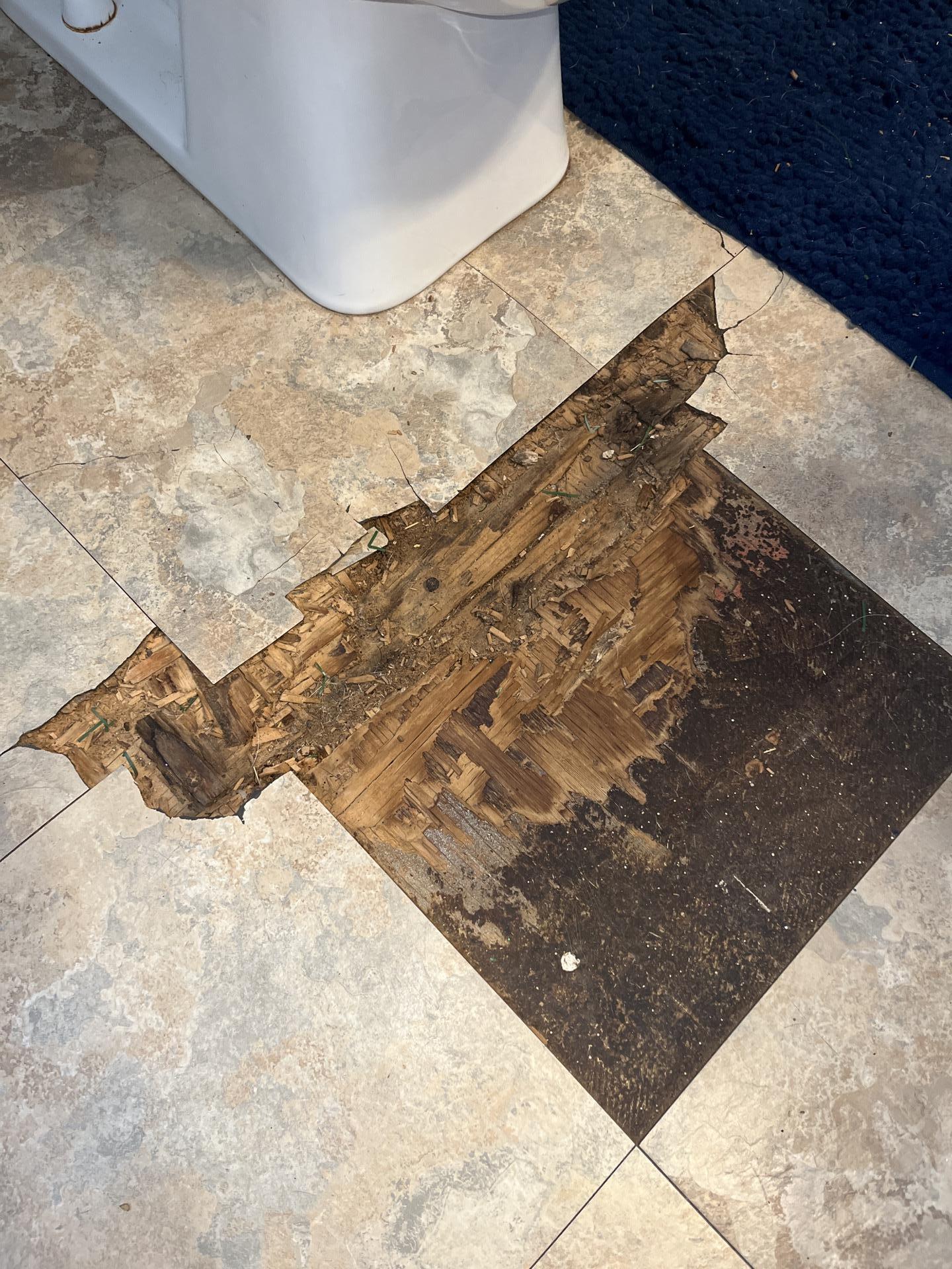 The customer experienced significant water damage in their bathroom, specifically affecting the flooring and subfloor around the toilet area.