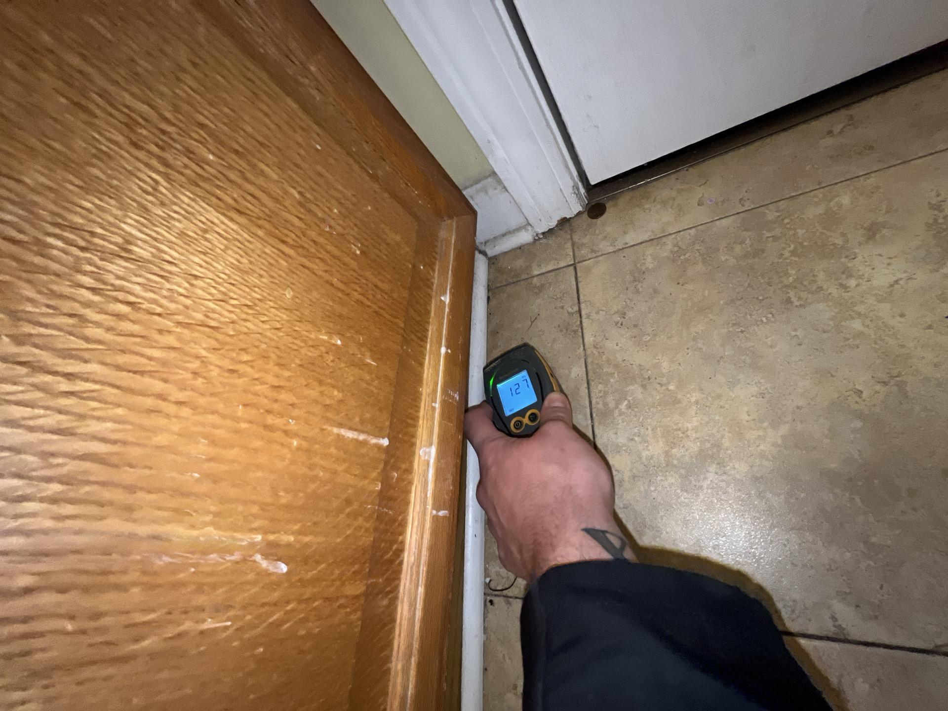 A technician's hand using a moisture meter to check for water damage on a wooden door frame adjacent to the bathroom floor, indicating thorough inspection.