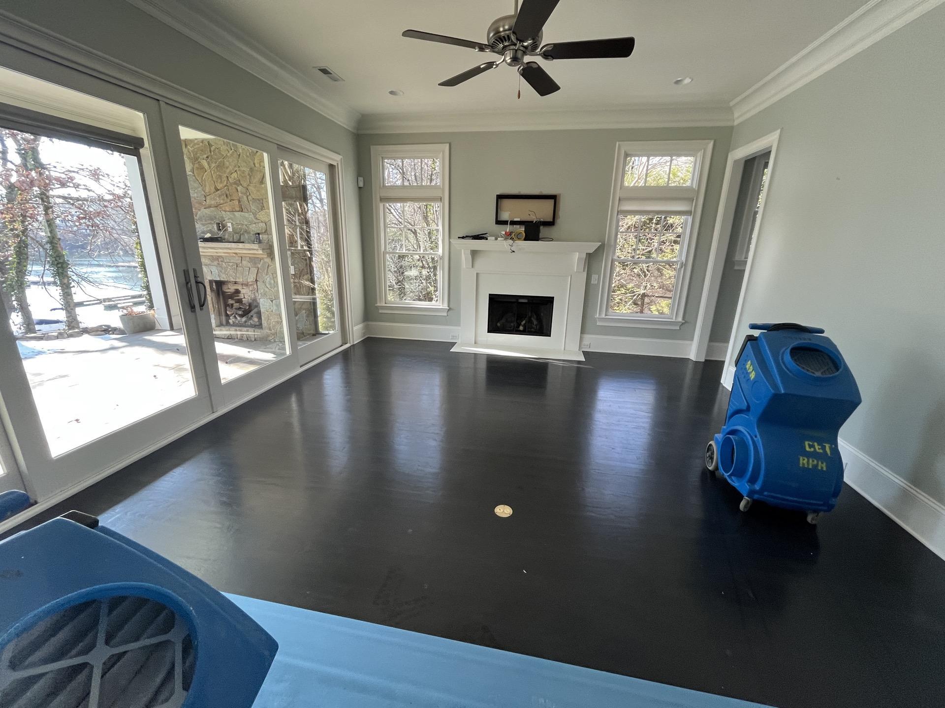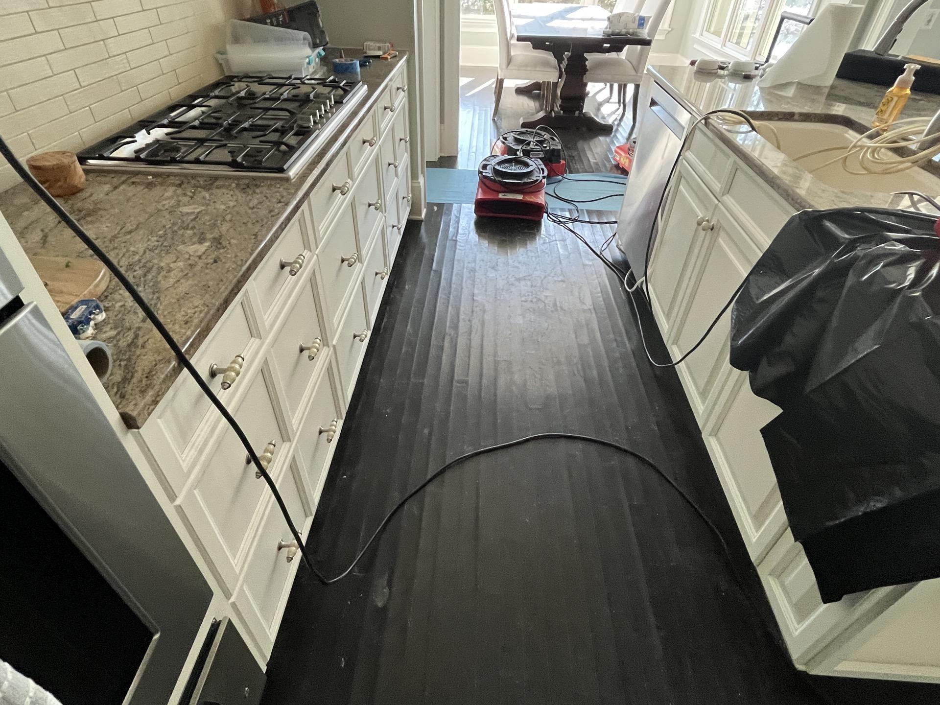 RestorePro promptly responded to the water damage, initiating a comprehensive restoration process. This involved professional water extraction from affected areas, followed by thorough drying and dehumidification using specialized equipment like air movers and dehumidifiers to prevent secondary damage and mold growth. Our team successfully dried the dark hardwood floors and restored the affected living spaces.